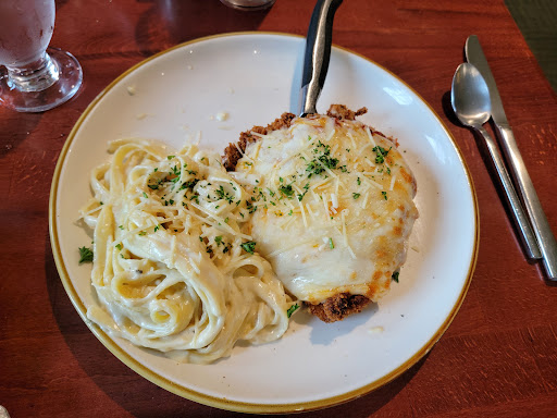 Amazing! This is my first time here and our waiter Jeremy was so wonderful to us, very kind and funny. All the staff were very wonderful but he really stood out! This was my birthday dinner and it was so tasty. Went on a Monday and had the special, Chicken Parmesan with fettuccine. Super tasty, saucy and cheesy, just perfect. Also ordered was a side salad with the balsamic vinegarette with the candied walnuts which was delicious. Even from someone who doesn't usually order a salad. I had the white peach Long Island cocktail which was super yummy and just the right strength. It also came with a peach gummy candy which is a nice touch. We also got the creme brulee and peanut butter pie (which they make in house). The creme brulee had a nice crisp crust and was super creamy, the peanut butter pie was very rich, and chocolatey delicious. Glad I split them so I could try both (not pictured because they were eaten too quickly). Will definitely be back soon to try more of there delicious food and drinks. The view below of the golf course was nice, they had outdoor seating available. There was also a waterfall feature outside with gold fish! The atmosphere...