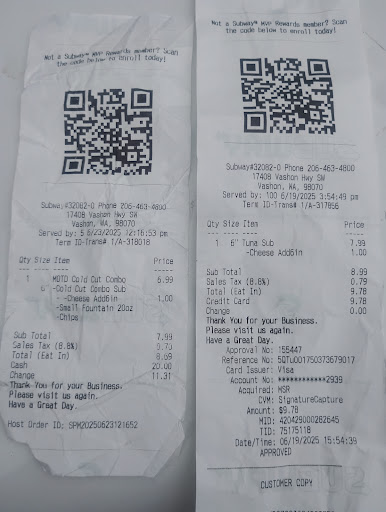 The 2nd time I went to the subway the man who served me that helped me the first time I came he was also working that day, so the older gentleman that helped me this time reminds me of a middle eastern Mr Burns from The Simpsons was extremely rude, his whole attitude his demeanor towards me was like why are you here I don't want you in my store lol 😂 I had to ask for extra spinach, extra tomatoes and definitely extra olives he gave me four olives I asked for more he got loud with me and told me he doesn't do that I told him I would like more olives that is not enough I even told him I would pay for extra so we went back and forth , he never gave me the extra olives that I said I would PAY for, I asked for mayo garlic aioli sauce and he put the sauce on half of the sandwich mind you this is a 6-inch sandwich 😂 , I warned him I was going to go to Google and report his behavior he does not need to be working there and if he is the owner he needs to be shut down and put out of business because he does not know the meaning of customer service very rude very disrespectful, honestly I wasn't even going to pay for the sandwich I was just going to walk out but my lunch break was almost over and I couldn't afford to go anywhere else to get anything to eat, to all my people of color stay away from this place 💯, this is a definite no return I wouldn't care if it was the only operating restaurant on vashon Island I wouldn't spend a wooden nickel in this establishment. And none of my construction co-workers will be spending money in that establishment as well, VERY...
