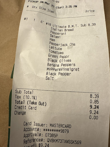 Ā Ā Ā Read moreSo I gave this location a try again and will not be going back number one. They donāt take any of the online coupons, but thatās not my issue. My issue is with the freshness of the bread. I purchased an ultimate BMT not toasted just regular bread as you can see on my receipt and the bread was not toasted when I got it I can tell the bread was super old or have been sitting out because it was just hard not toasted. Thereās a big difference Really irritated that I could not enjoy my sandwich because it was just hard bread. I donāt know if it was bread from the day before or a couple days ago, but literally I had to pee off probably 75% of the bread and pretty much had like a salad. My sandwich is pretty...