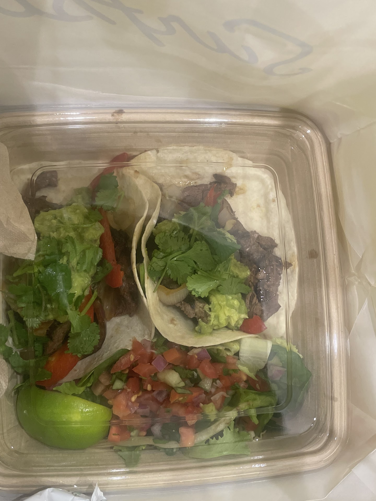 I ordered Cabo San Lucas tacos - grilled steak with guacamole, peppers, onions and fresh cilantro. I substituted the rice with salad and pico instead of ranch dressing and it was a late night Meal with zero regret. I gave away one taco to my family and I was still satisfied. The portions were great.