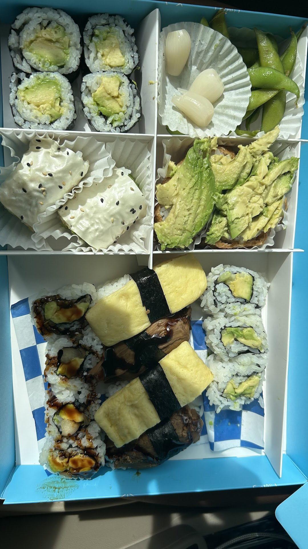 Very disappointed as I had high expectations based on the reviews but their vegan sushi is basically unseasoned avocado chopped up and rolled into various shapes. Iâve had much better vegan sushi at Planta Queen in DC and Beyond Sushi in NYC. For the price (I got the $40 big vegan box) youâd expect more variety. Like even regular sushi places have an asparagus roll or sweet potato roll. Not the case here. The box included 5 edamames pods, two eggplant sushi pieces, two vegan egg sushi pieces then avocado on avocado on avocado. lol for example the only difference between the vegan California roll and the avocado roll is that the California had a small sliver of cucumber. I suspect the person who made this menu isnât actually a vegan. So many veggies to play with and theyâre using none. If youâre looking for good vegan sushi look elsewhere. If youâre looking to eat avocado and rice in different shapes, theyâve got you covered. Will...