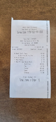 Silverdale's Taco Bell is reasonably handy, 3051 NW Bucklin Hill Road, Silverdale, Washington. It's across Bucklin Hill Road from Massage Envy, within walking distance to Staple's and Joann Fabrics.
