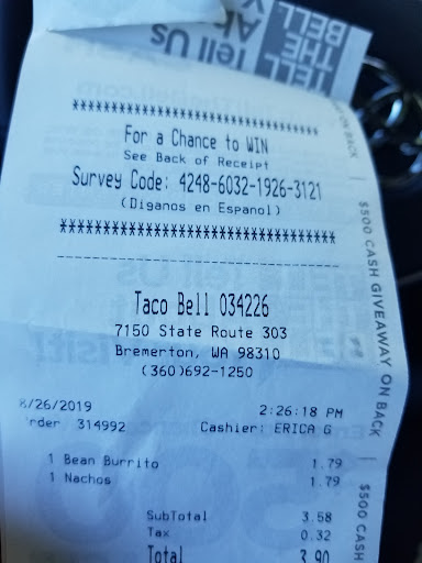 If you don't know where Taco Bell is located, their location is 7150 State Rt 303 in Bremerton. Across the 303 from Walmart and Mcdonalds.
