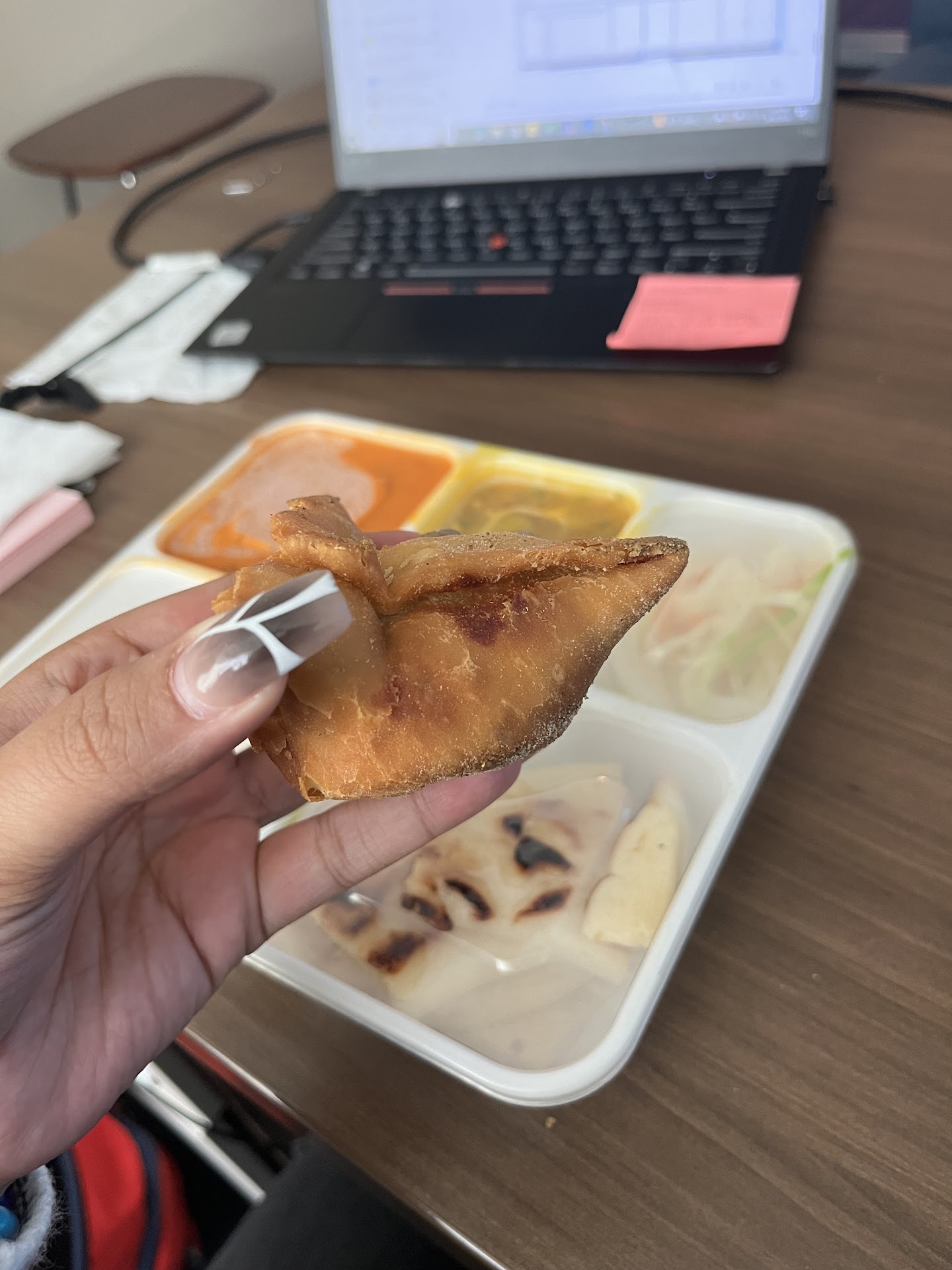 Chicken Kati- The paratha seemed to be whole wheat or something? Never had paratha like it. Didn't care for it too much. The fillings were a bit sparse and more pepper and onion but not much chicken, but the chicken was good. Would've liked more filling, and more chicken. However, it was a long wrap-- almost as long as my forearm! Just would've wanted more filling. It was nice and warm, wrapped up in foil.