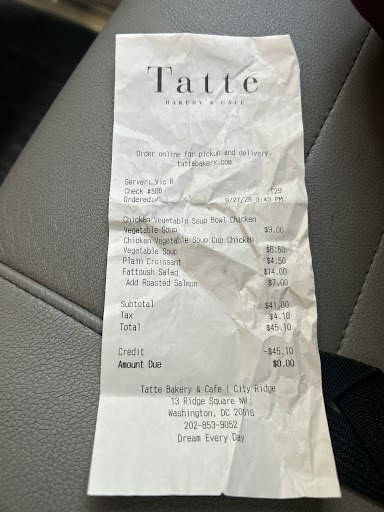 Read moreRegret giving a 20% tip because the employees did not have a care in the world. One of them walked away with our table number without asking if we were waiting for more food. Then my food was left on the kitchen counter for a while until I asked an employee to check if it was my order. By this time my food was cold. I was sitting at a table next to the kitchen the whole time and I saw two employees talking about the plate on the kitchen counter, which turned out to be mine. But for some reason they didn’t bother with it. It just sat there. I don’t think Tatte would randomly cook up dishes unless someone orders it. Neither one of the employees bothered to even figure out who the order belonged to knowing fully well that someone in their cafe is waiting for that food. Think twice about giving them a tip because they may not perform...