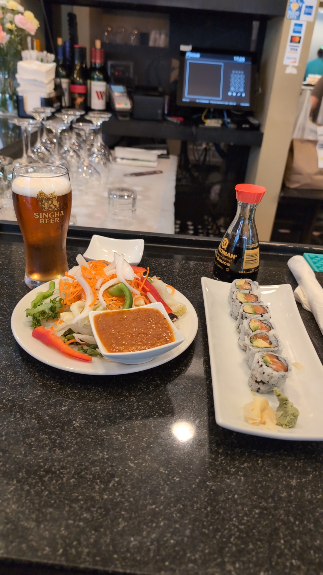 Sale Thai in the Rhode Island Row complex is a quaint clean Asian chic decor, DC hidden gem. This location has a Sushi Bar off to the left side of the main entrance. The Sushi bar is beautifully decorated with precision cut seafood in bright beautiful color and textures the Chef we amazing to watch him prep and prepare your food to order. There is a medium size bar with premium and some top shelf liquors. It's neatly stocked with a 60" flat screen posted directly above the bar. Also its the first thing you see when walking in the restaurant with the kitchen entrance opening viewed directly behind it. Great gathering spot especially for happy hour. Also family friendly with the dining room side. The staff is friendly welcoming and well spoken. The food is Thai cuisine fantastically cooked to order. Beautiful presentation of plated dishes and unique appetizers. The menu is plentiful but not overwhelming with a million different choices. The choices are great and there's even organic dishes, vegetarian, a few desserts, appetizers, lunch specials, and more. The fried rice with a choice of meat(lump crab or shrimp) with or without Is AMAZING!!!!! I had the fried rice with both crab and shrimp added. First the meal was placed to order and it was a Togo order. It came in a timely manner I went on a Saturday around 2pm. The bar we full a few diners in the restaurant. I sat at the bar and waited on my order. The waitress brought my food I peeked in the bag and was amazed at what I saw. The rice is coated in a light colored brown sweet and savory sauce which is not over powering to the other flavors it was mixed with square cut carrots, shallots, onions and peas there was also tucked in there two cherry tomatoes split in half with crumbled fried egg on top. With about 6 plump perfectly cooked jumbo shrimps and a large scoop of fresh jumbo lump crab meat placed onto of the rice mixture with a parsley garnish to finish off the look of the dish. So it looked fantastic but the TASTE WAS AMAZING!! It is hands down the best fried rice I have ever had. I loved it and it's enough in the dish for two people. I saved half the next day it was still good the next day reheated. I had a few other dishes here from Sale Thai all were good in their own right but my personal favorite is the fried rice. Gov this place a try you won't be disappointed. Parking in front is limited and metered parking by coin or credit card. There is a parking garage across the complex next to Dunkin Donuts. It's $5 for 4:00 hours but one minute past 4:01 it will cost you $25.00 to get out the garage. The CVS does validate garage parking tickets...
