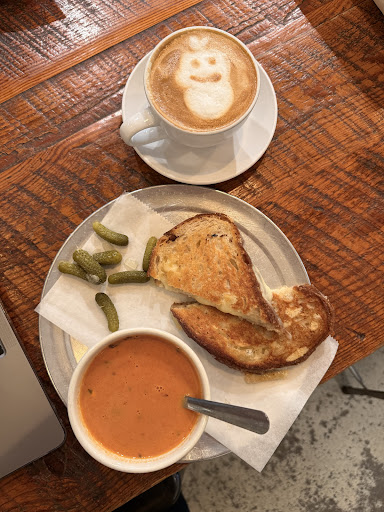 Read moreI hadn’t been here for a while because it is a bit on the pricey side, but I was really not doing myself any favors because the food and coffee is absolutely phenomenal. It was a gloomy, rainy day and I was craving comfort food, and their grilled cheese and tomato soup absolutely hit the spot. The place does get very crowded, but I was still able to find a seat, and as the lunch rush slowed was even able to move to a spot by the window with an outlet. It’s a really great spot to treat yourself to a new book from upstairs (or bring one you’re working on!) and enjoy being around people while you have a coffee and read, and you’ll see a lot of that there. It’s also a great place to sit and work.