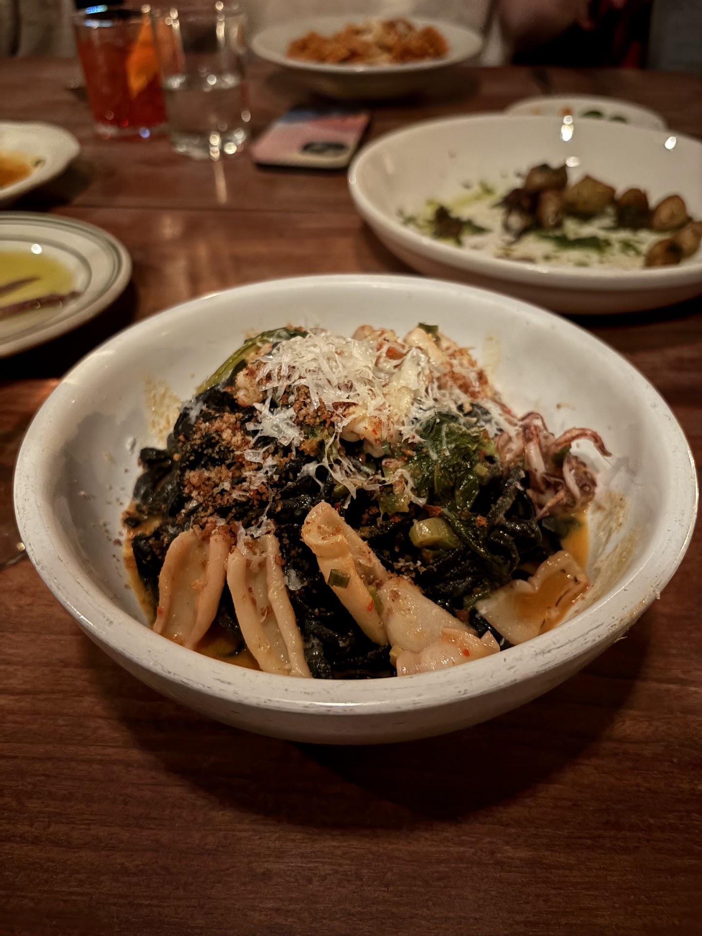 They also did a phenomenal job with all dietary restrictions. I'm pescatarian, and they walked me through each item of the menu that could or could not be adjusted to be pescatarian. For their pastas, the spaghetti and malfade are already vegetarian and the linguine is pescatarian, and they're able to modify the rigatoni by removing the sausage and/or substituting it with mushrooms and spinach. The creste di gallo is, unfortunately, the only dish that they can't make pescatarian, but it's honestly impressive how willing and able they are to accommodate vegetarians / pescatarians. We also had a few allergies at our table, but the server did a phenomenal job accommodating us. They take every allergy incredibly seriously, and they absolutely made a strong effort to make sure everyone could eat everything on the menu without worries. Their various tree nuts are fried in peanut oil (which I'm allergic to), but they put everything that included nuts...