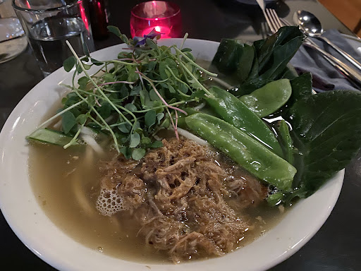 Read moreI was initially attracted to their website hero photo because of the type of vegetables and various cuts of meat shown. We were able to get a table at the last minute. I wasn't going to order a bowl of anything. But when I saw people eating noodles from a big bowl, I changed my mind. I was impressed with the bowl of meat & noodles I received. I wasn't quite expecting the taste and presentation of pork shoulders, pulled pork with BBQ taste wasn't something I expected in a bowl of noodles that looks very much like fusion ramen. After the first taste, I wish I had ordered the braised beef instead. The bone broth, however, was amazing. I also loved just how raw and fresh the vegetables were. My sugar snap peas were definitely locally grown, hardly cooked and very sweet. The choice of the other vegetables were excellent as well, unusual. I couldn't recognize what the egg noodles were trying to be, it didn't have enough chew as Japanese ramen or udon, neither did it resemble other Chinese or Italian egg noodles I am familiar with. There is a a soft boiled egg which I deliberately left in the hot broth for as long as I can and only attacked it once I ate everything else in the bowl. To my surprise, the egg was still cold, soft boiled, but not salty or soy infused. This experience left me wanting to visit a ramen restaurant ASAP. The highlight for me is taking the remaining bone broth home and tasting it again the next evening. My partner ordered the Medium Salad with smoked Kirsop Farm Chicken. I can tell he didn't enjoy it, especially when he declared that he does not want to repeat that experience. Ruby Rink is closed on Mondays, so, I am prevented from trying other interesting items such as sandwiches and country pork pate. The servers and host were all very friendly and provided excellent service. I agree with their philosophy and if I lived on Vashon, this would be my...
