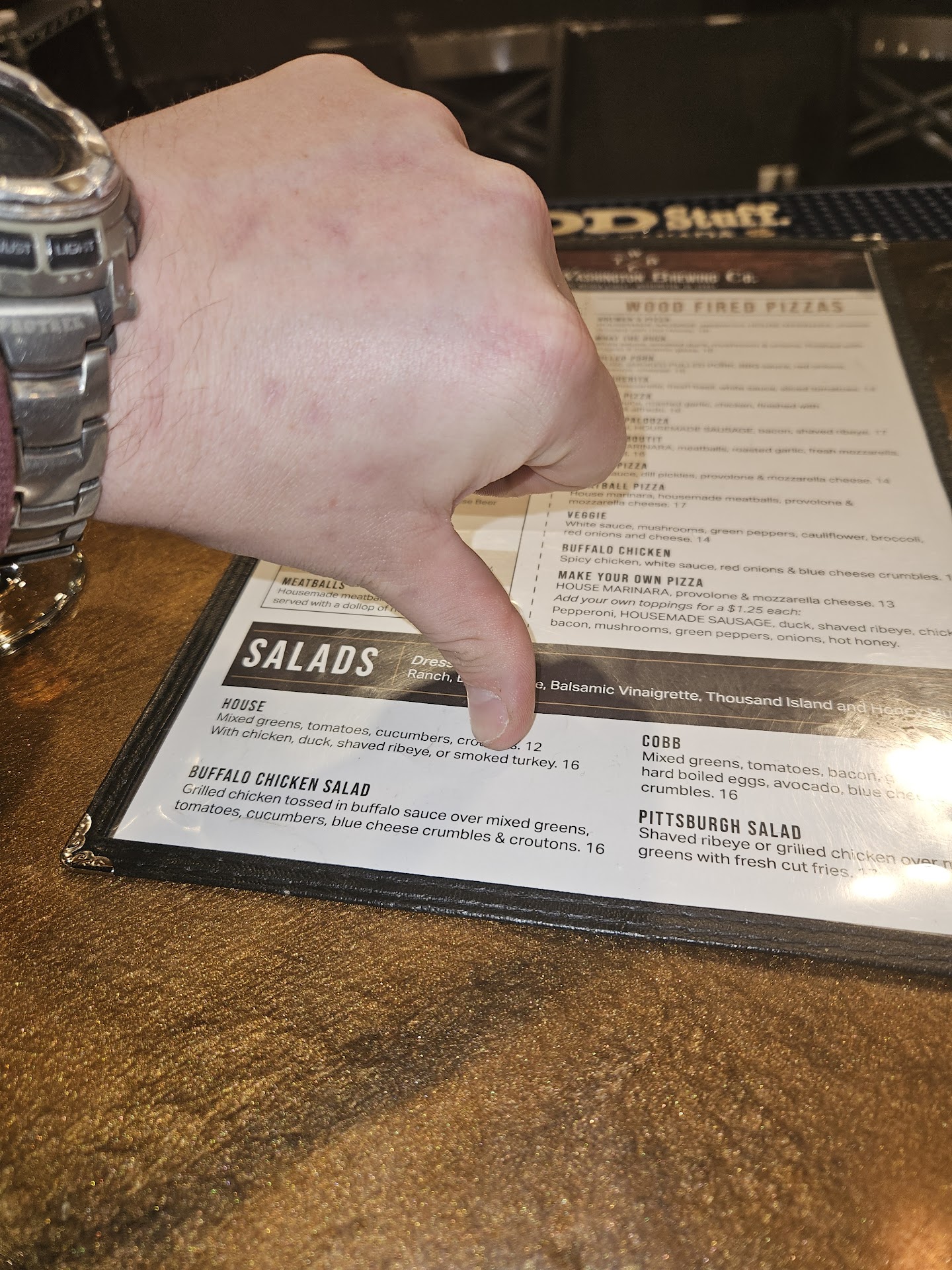 Read moreWe go out to eat once a week and try to support local restaurants. We got the Steak Salad and Chicken Parm Slammer and 2 beers. The Steak Salad we received was basic salad mix, 2 cherry tomatoes, grated cheese, and a bit of steak. Was advertised to come with a "mound of fries" on top for $15. The Chicken Parm Slammer was fine, but the roll was pretty basic (something you could buy at Giant Eagle) and fairly bland. We go out to eat once a week and try to support local restaurants and we were very disappointed with quality of the food. The beer on the other hand was very good and the only saving grace. We very much enjoyed the beer, however the website was very misguided with the selections that they currently have available and in stock. I had to go through 4-5 selections that were on the website before I found 2 beers they had. When I got there, they didn't have have the Crowlers poured, despite having and no other take-out orders out other than mine and the servers did not look very busy. The 2 people I spoke with over the ordering and pick-up process were friendly.