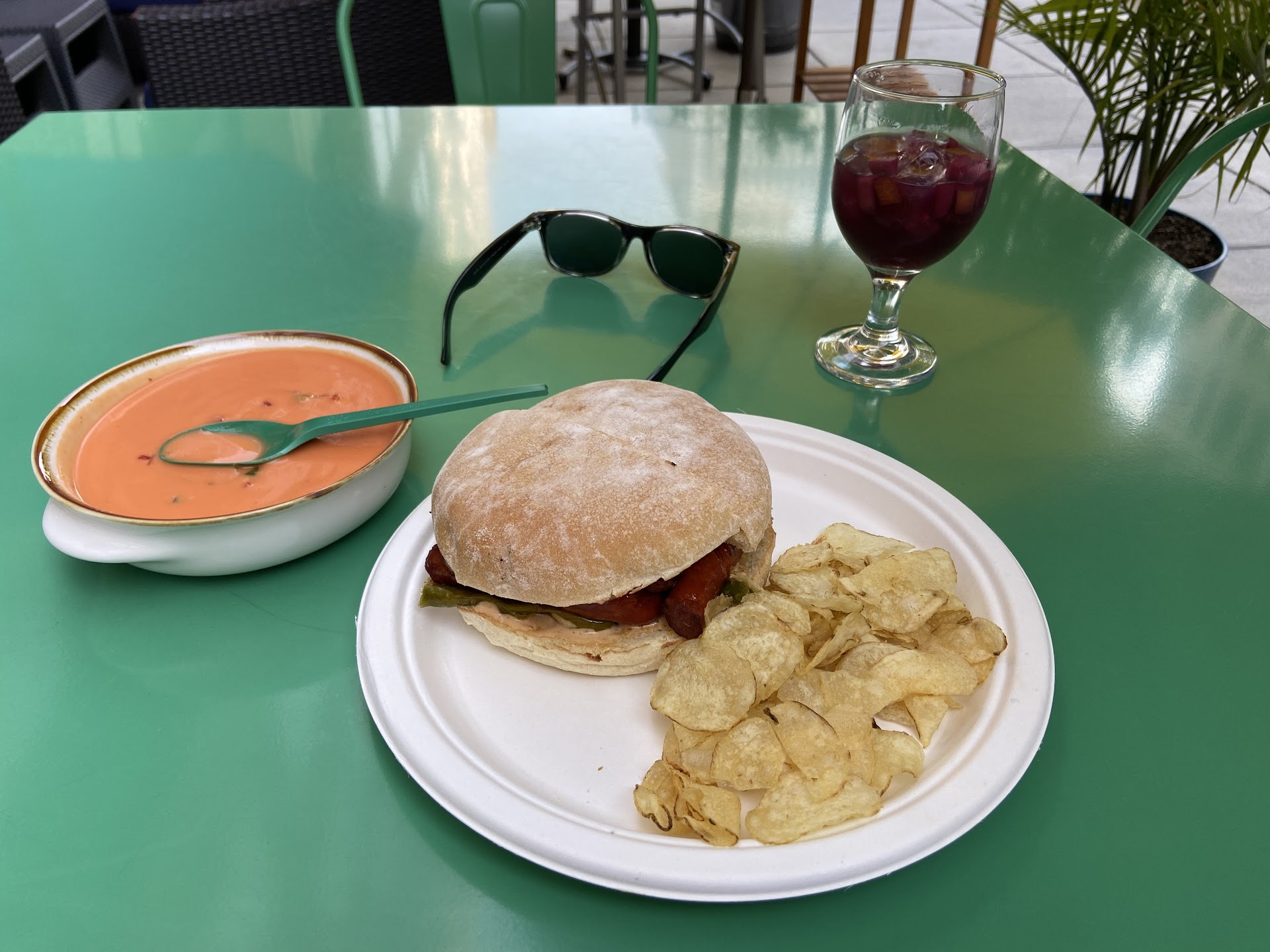 I decided to check this place out for something different for lunch. The location is cozy with inside and outside tables. The outside tables are well shaded with umbrellas which made a difference on a hot, sunny day. The inside seating consists mostly of high, bar type tables with a few larger low tables. It also functions as a Spanish grocery store which gives one something interesting to look at whilst eating.