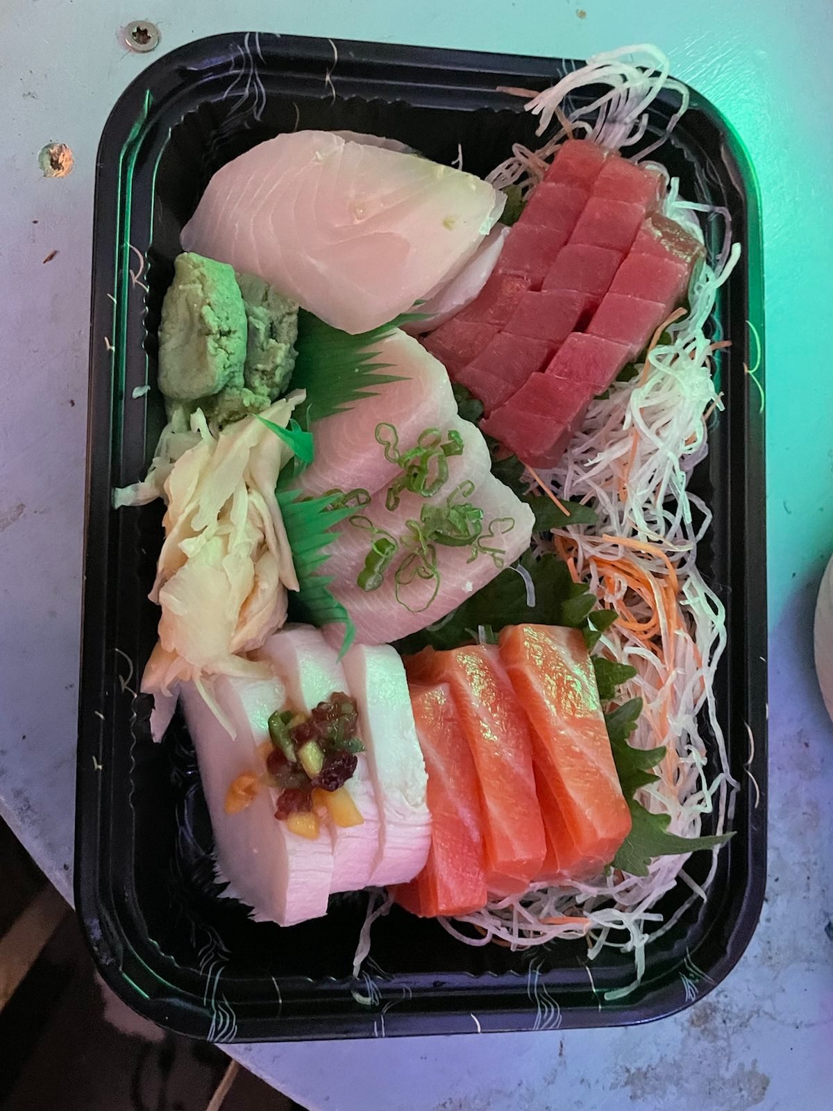 Read moreHaven't reviewed much but this place disappointed me so much so starting here... I got the Sashimi Deluxe. Seemed like a good deal, and they were offering $10 off, but the pieces of sashimi were among the smallest I've ever seen, and I was immediately taken aback by a gassy odor when I opened the lid. Most all of them had a weird aftertaste. Some fishy, and some like gasoline? I love sashimi and wish I hadn't spent my Uber Eats here. I also got it as delivery, and for 15 pieces of sashimi, one half-full condiment cup of soy sauce seemed skimpy... but then again the pieces are so small, maybe it doesn't matter! But I really don't want to finish the sashimi anyways... I also got the friend banana, which just isn't very good. Total mush, couldn't hold a fork to it, and the breading is odd. Quite frankly, it simply wasn't good. Sometimes a deal is too...