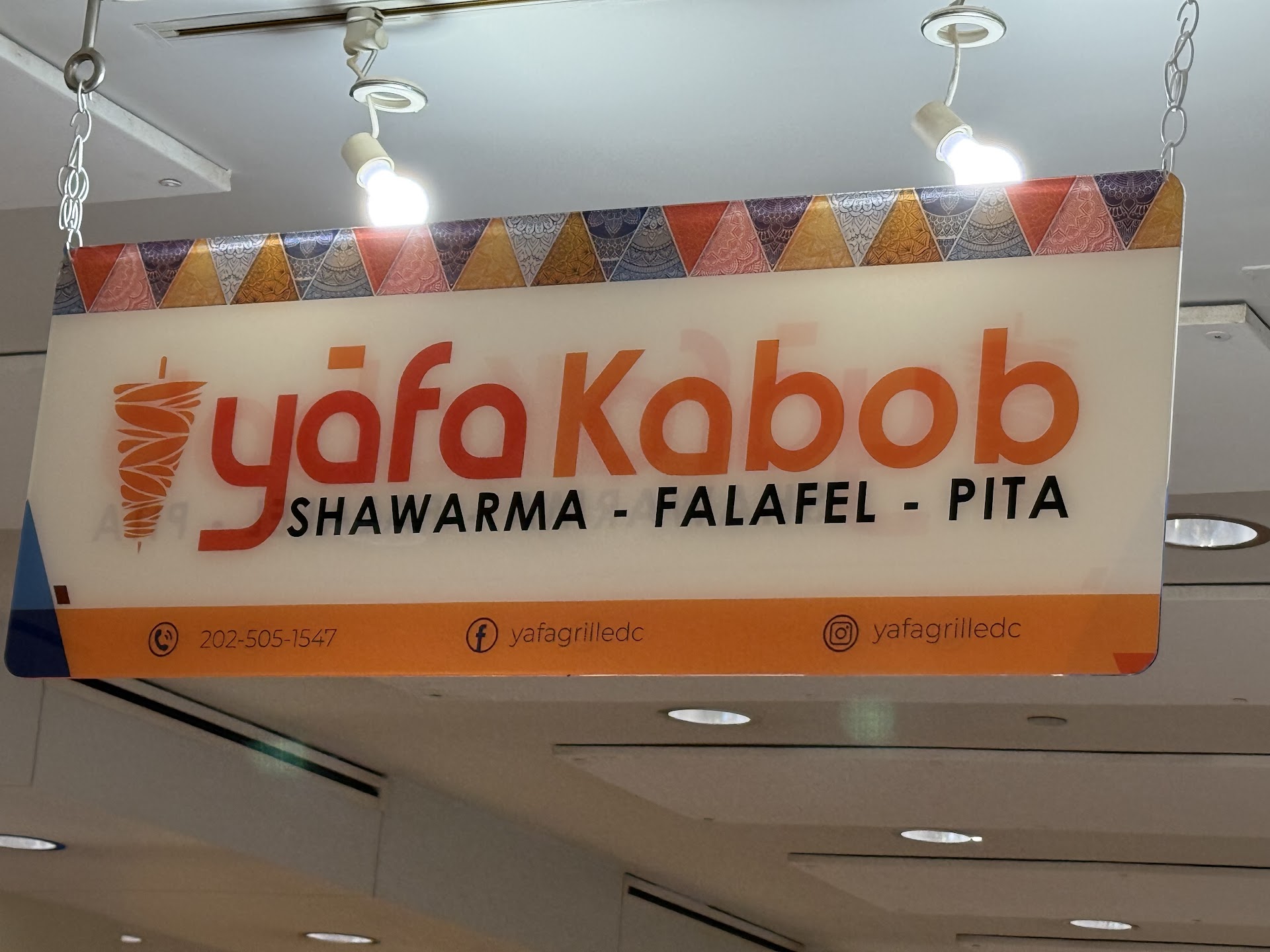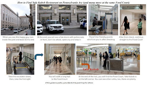 It's in the basement of the Reagan Building. Hard to find, but it's part of a huge food court with options for everyone in your fam... pizza places, sub places, gelato places and more. Stop by this kabob place, forget about the food trucks!! There are seats, air-conditioning, bathrooms and this amazing place!! It's a federal buidling, so follow the arrows to find the entrance, get yourself scanned by security and head...