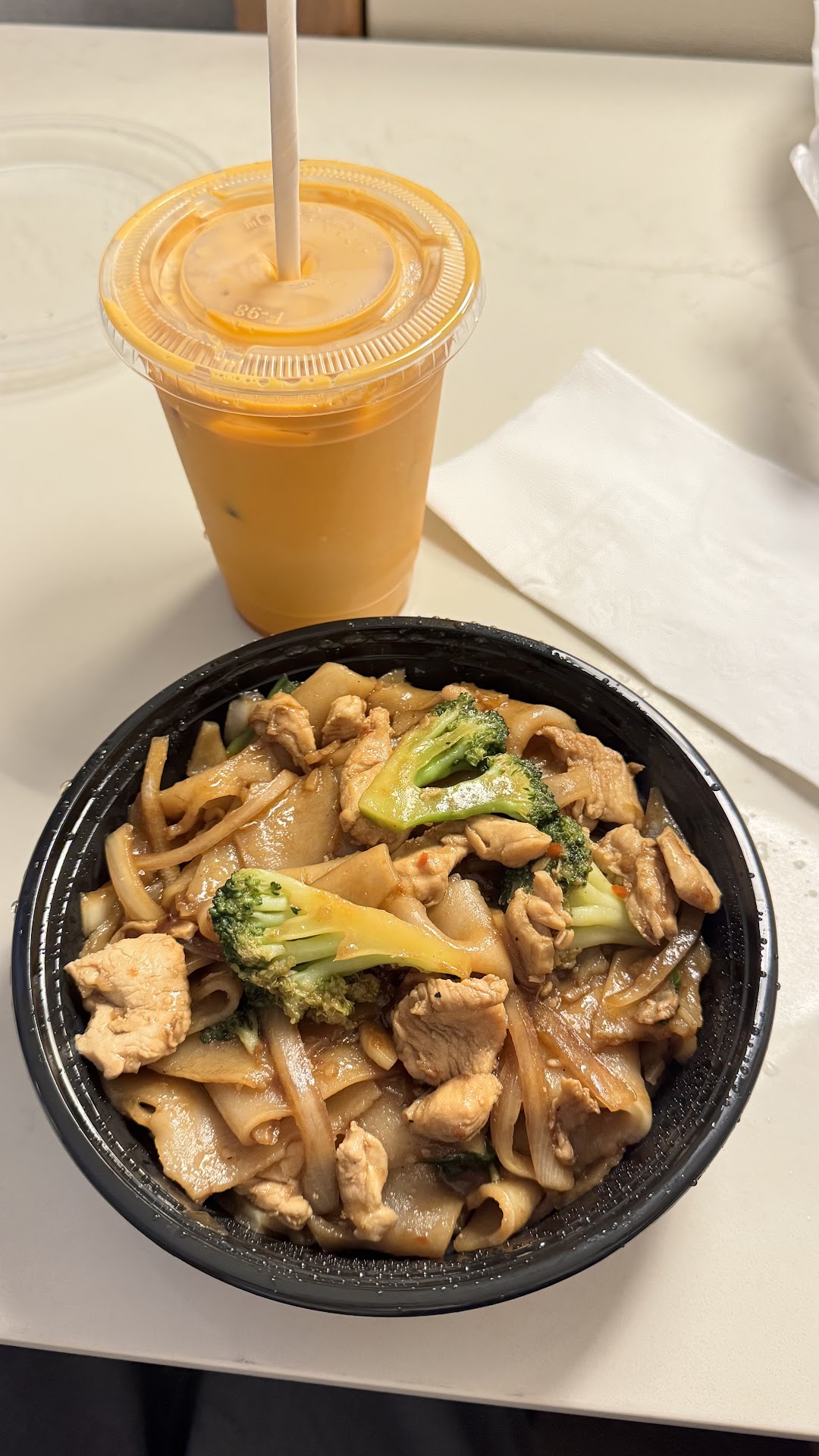 I got the Drunken Noodles with chicken, no spicy, no bell pepper/tomato/bamboo shoots. They did great following my customizations but note that it was still a /little/ spicy, so be warned! It was delicious though and well worth the wait. Everything was cooked well and seasoned well. I would recommend the dish, especially if you’re a fan of Drunken Noodles.