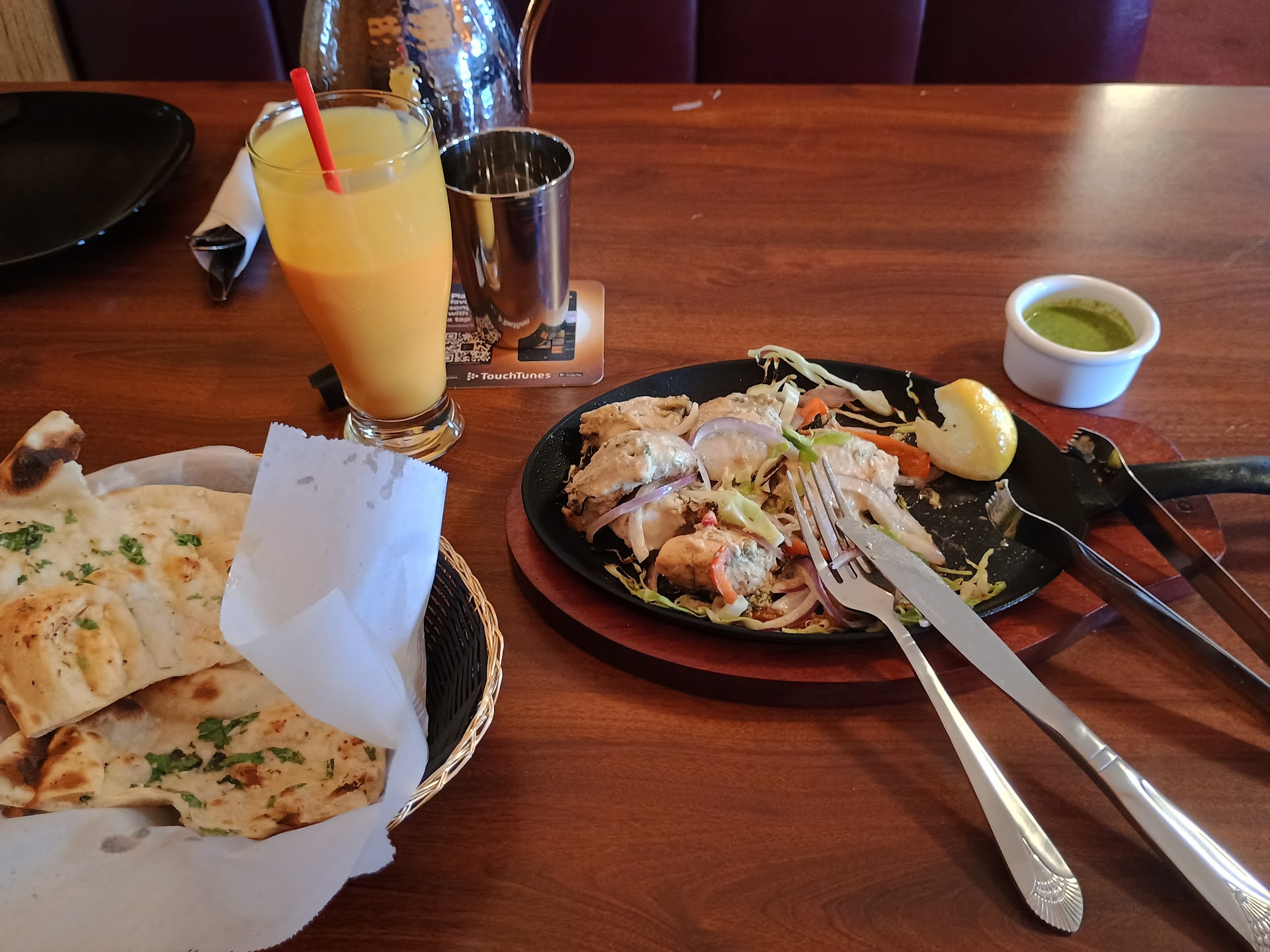 Ā Ā Ā Read moreThe food was amazing I got the Afghani Malai tikki kebab, the garlic naan, and the mango lassi, the kebab was delicious served on a sizzling cast iron plate with onions, cabbage I believe, and some other vegetables, the chicken was tender, buttery, and packed with flavor though not as spicy as I had thought it would be, they did say that if you want the dishes to be spicier you can always request that, their green salsa was the star of the show though it was amazing and packed with flavor it definitely complimented the Afghani kebab, the garlic naan wasn't anything special but still delicious and went well with the chicken kebab, and the mango lassi was delicious it's a mango yogurt smoothie, they also have gluten free and vegan version for most of the dishes, the service was great and the music was good, I will definitely...