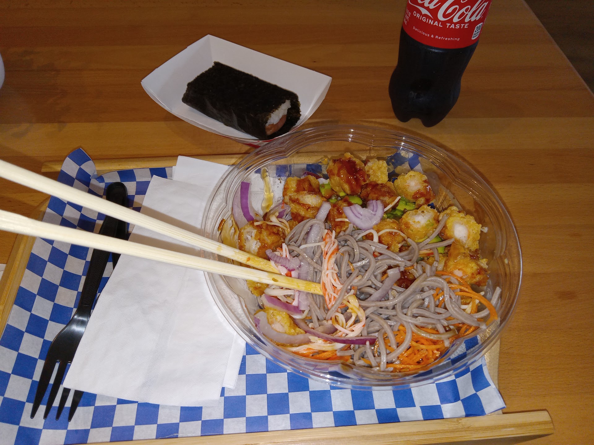 Read moreThis was $4 cheaper than the first poke bowl place I'd been to, with more in stock, interesting variety, and much better portions. I got the tempura shrimp seafood bowl (comes with shredded imitation crab) with buckwheat noodle base, withheld the spicy mayo, plus half an egg. Added musubi which was made to order.