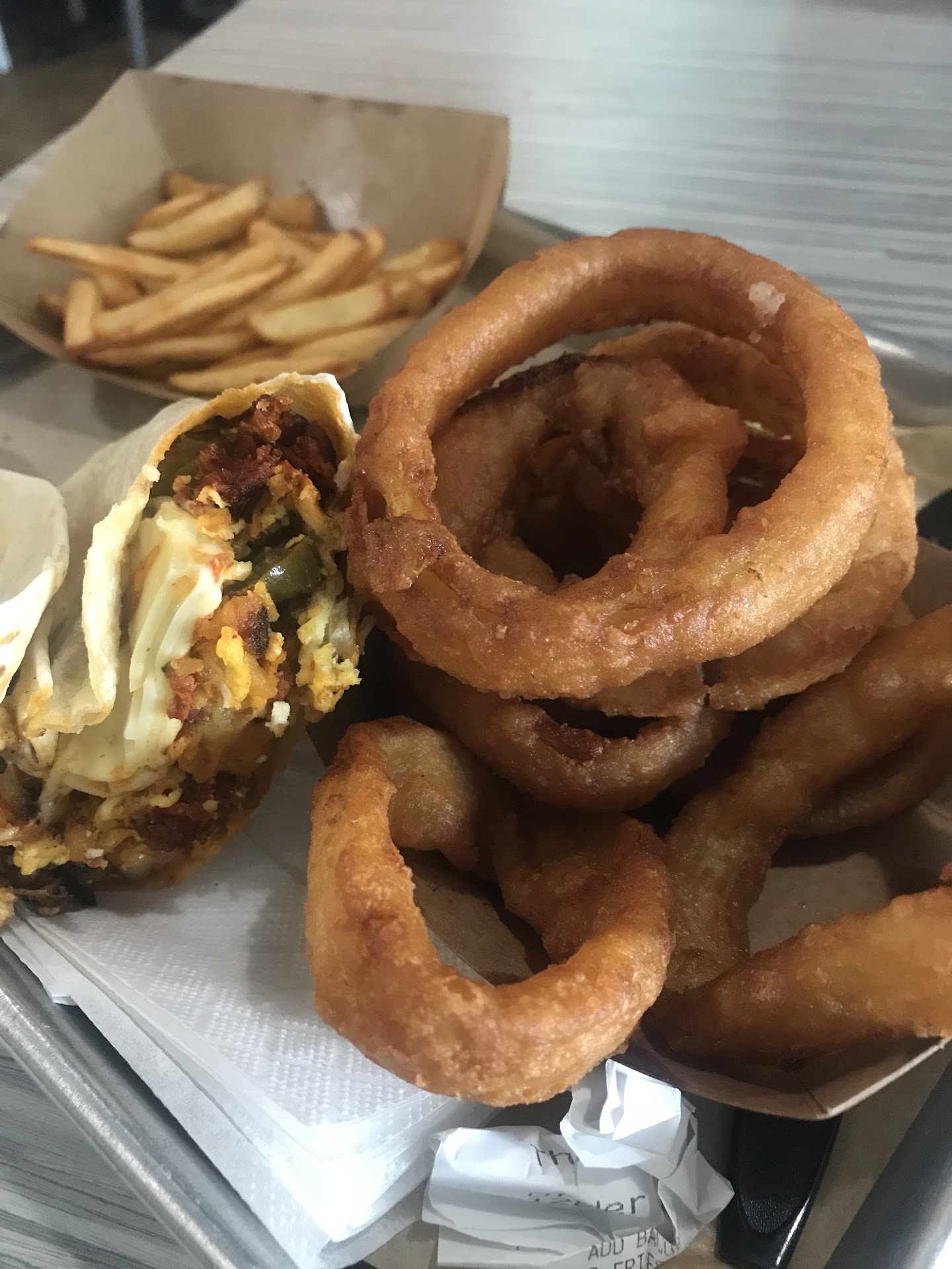 So I decided to order some additional items to give me a more roundabout feel of the place so I ordered a chorizo burrito which is not on the menu but they assured me that they could make one and an order of onion rings.
