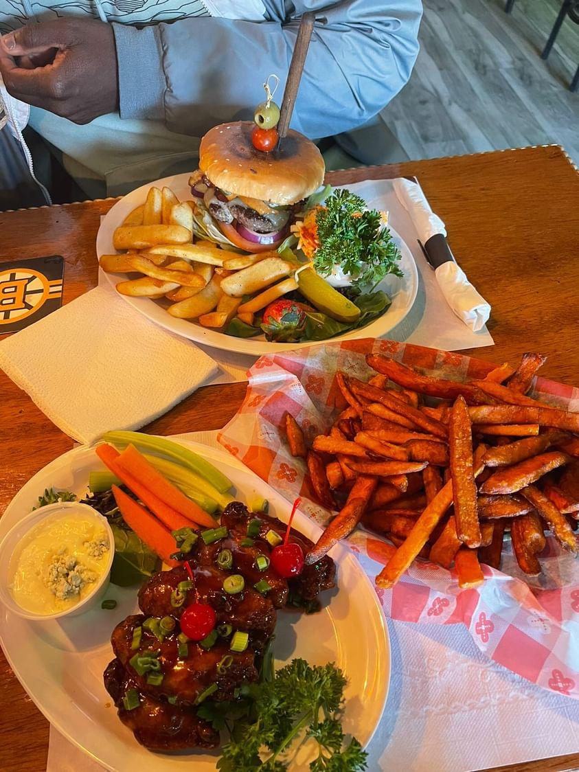 As I've said many times. I love a Hole in the Wall spot. Bailey's Cafe might take the Cake. If you are near or far definitely stop in for lunch! I indulged in a savory Chipotle Bacon 🥓 Ranch Burger made to order, fresh thick sliced vegetables with steak fries. The Bourbon Wings made me Regret only ordering 6 should've taken 12 more home 🤣🤣🙈. Sweet potato fries for the win crispy to the order, fresh coleslaw..... The Bill came to $37 something I tipped $15. Compliments to the Chef. If you are reading this go get the Bourbon wings 🎉🎉🤲🏿🤲🏿 Picture below disregard my hand I was getting ready to devour...