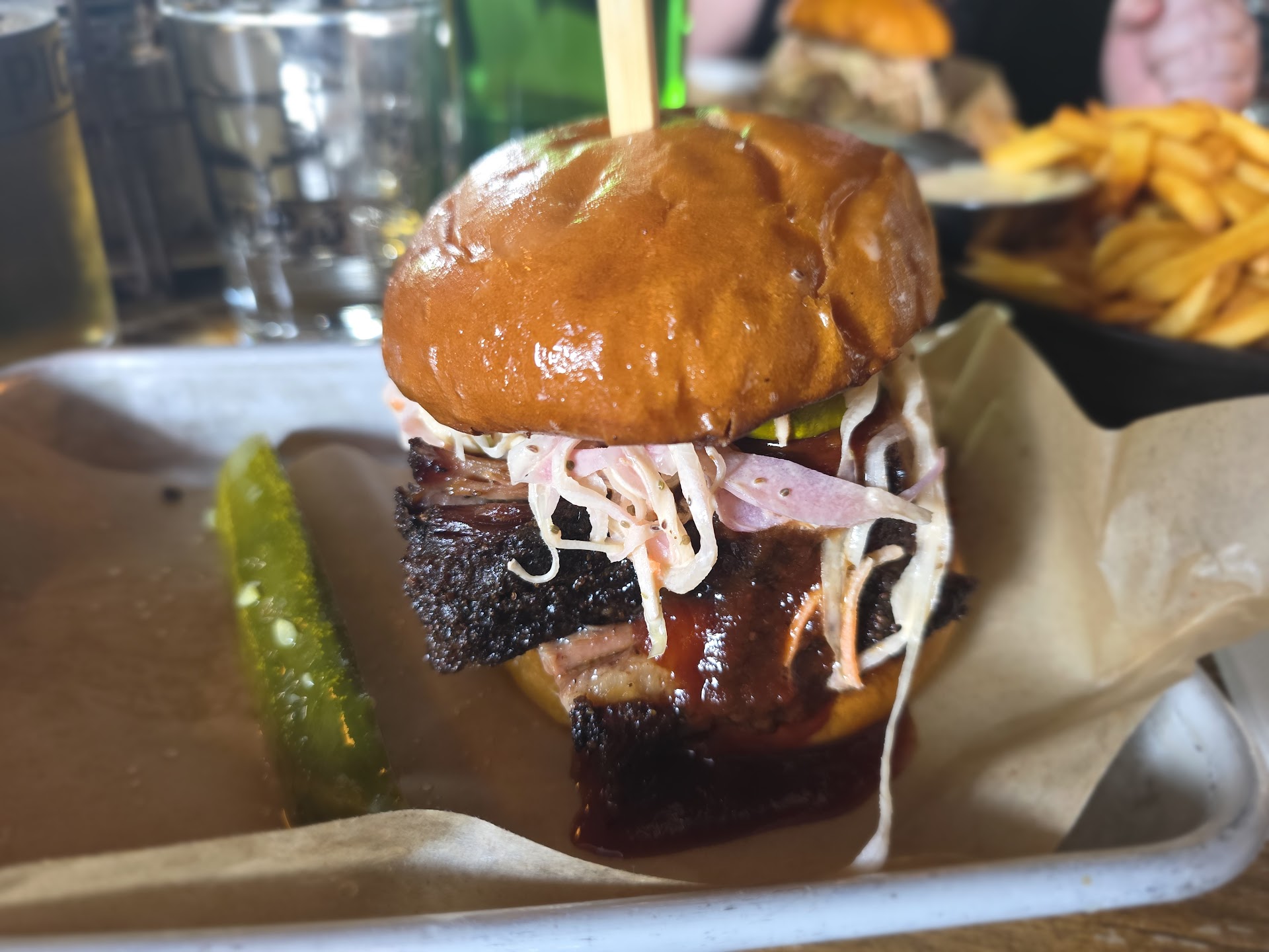 Let me tell you when I said I couldn't open my mouth wide enough for the monster cuts of brisket. I honestly didn't think I was gonna be able to power through all that sandwich, and pro pig is not known for skimping on the portions. Blew my mind. Came with slaw, and pickles on the sandwich, I drowned it in the hot sauce. So so so so so good.