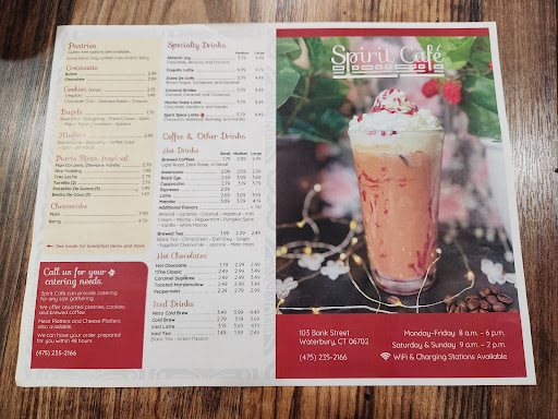 Read moreI just moved here to CT from NYC this September and came across this gem of a coffee shop. Definitely gives me a taste of home every time I come in. Coffee is brewed to perfection, amazing assortment of pastries from Spanish to American culture. Staff is exceptional, warm and very inviting. Extremely spacious, whether you’d like to hold a conference, a small business meeting, or just have a coffee date. There is more than enough space. Management is delightful and make great conversation! Location is amazing there isn’t another coffee shop for miles! This was a great addition to downtown Waterbury and I can’t wait until my next visit! Iced lattes, lightly toasted everything croissants, and spinach bagels are favorite! Definitely come in and try for yourself! Wishing spirit cafe all the luck on any future endeavors. Thank you!