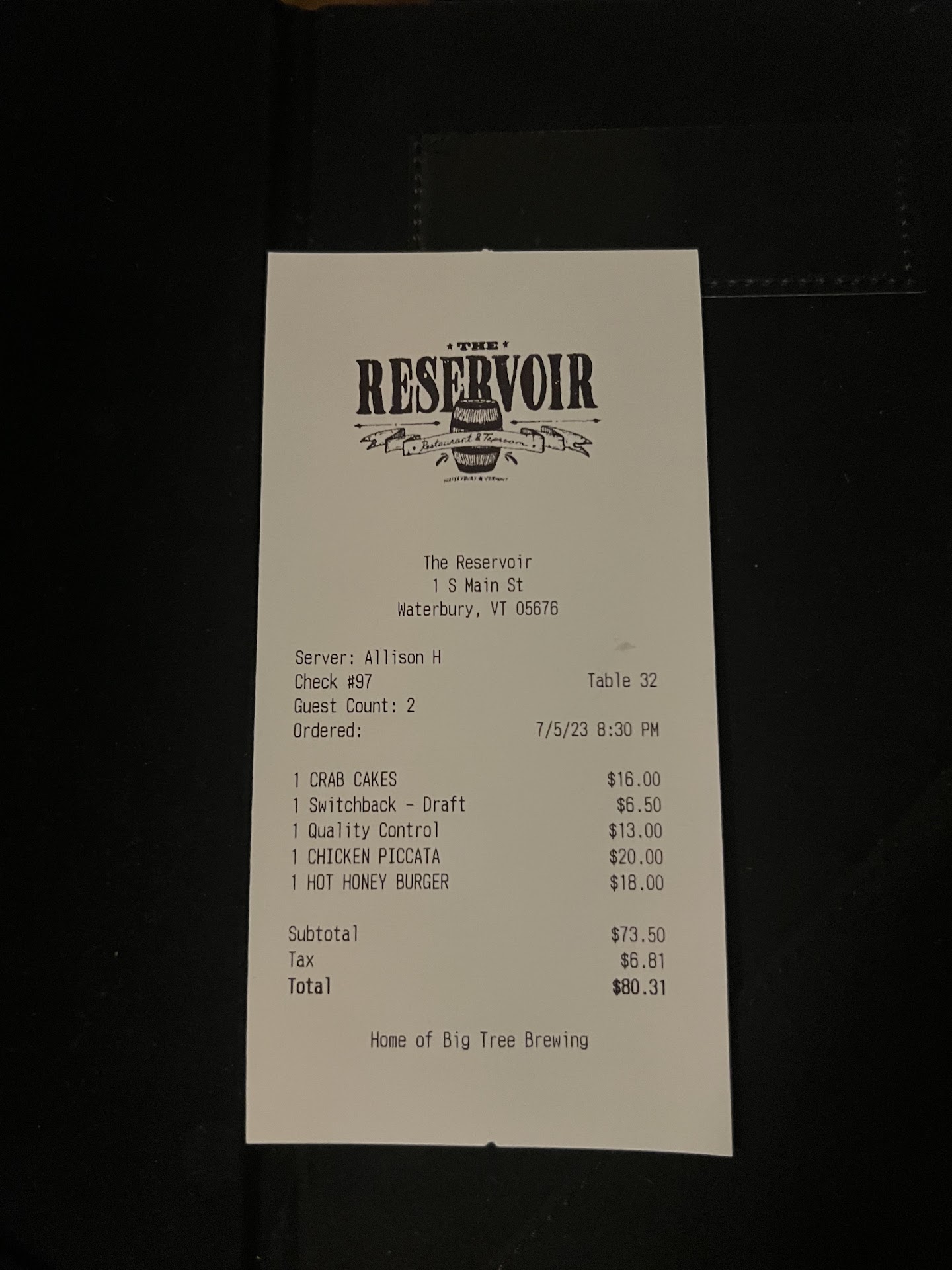 Waitress wasn’t great. Name on the receipt if you’re really interested. Service was infrequent, and she literally waited until the kitchen was closed to give us the check without asking if we wanted desert. My wife had her heart set on a particular desert and even asked if she could have it to go, but no dice. ‘The kitchen is closed.’ Well thanks for the poor follow up, service, and warning. They hate dessert and upsells at the ‘new’ Reservoir.
