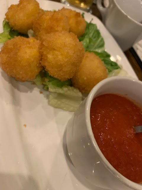 Tonight we had an excellent supper. My one true love and I started by sharing an order of calamari with hot peppers and gorgonzola. It comes with a very good marinara sauce on the side. I tasted the calamari before drizzling some marinara on it. It was done perfectly. We each had a cup of their delicious pasta fagioli. As entrées she had Paglia e Fieno (translation: hay and straw - some of the pasta noodles are green, and some yellow) which is spinach and egg pasta with peas and prosciutto in a creamy Alfredo sauce. I had veal and shrimp piccata, one of the evening's specials. Time had definitely been taken to prepare the veal. The dish was delicious. I also had a garden salad with a very good house made peppercorn dressing. We accompanied our meal with a Ruffino Superiore chianti. We finished with dessert. She had bomba, which is chocolate and vanilla Gelato made into a ball, and covered with a hard chocolate shell. I had cheesecake brulee and an espresso with Sambuca. We don't go all out like this every time we come in, but it's nice to know you can be extravagant if you want to. Have a look at the menu. The price is always reasonable for all of the many dishes. I can't praise our waiter Nico enough. He took very good care of us, and was at the table often. We ask for him...