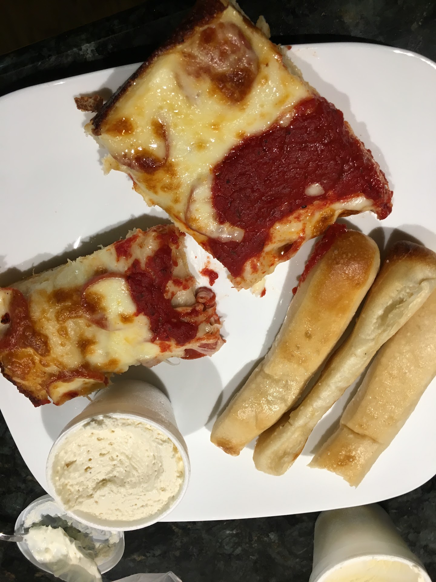 Read moreFood was pretty bad (in my opinion). Like many others, I heard that the bread sticks were "incredible". But, after trying them, I have to say, they were very below average. While the seasoning (garlic/parmesan flavor) was certainly good, the bread itself was very, very cheap. Not dense and chewy at all, but dry/very airy/kind of hard/not fresh and chewy. Not much substance to the bread. Also, the pizza was surprisingly bad. Very cheap cheese. The kind of cheese that instantly turns to rubber after coming out of the oven, and it all comes off the pizza when you take a bite because the cheese won't tear apart. Not much flavor.