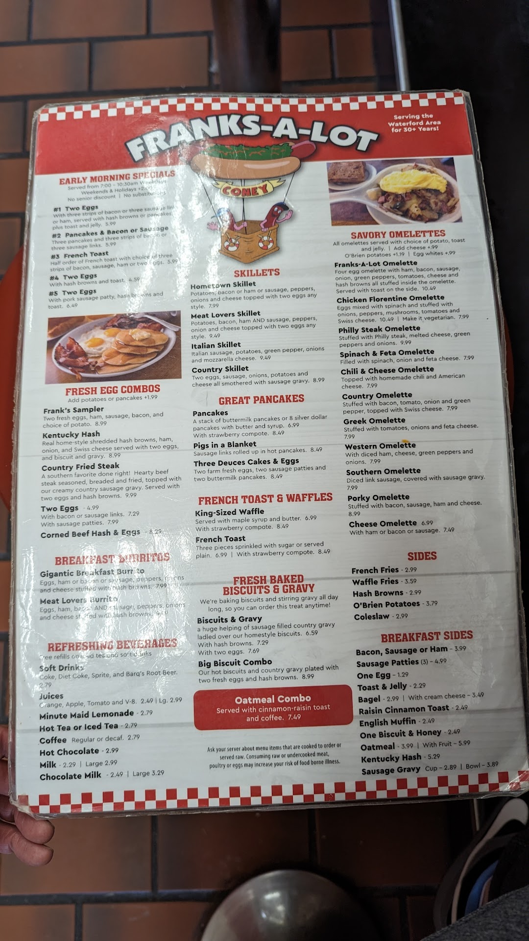 This is my first time here as I was again visiting and in the area. Very pleased we stopped in:) Small Mom and Pop type diners are becoming a thing of the past in our area. Of the few some have become “tired”,however, here at Franks-a-lot you will experience what you remember from your fav old school diner! The restaurant is very clean, in great repair and decor. Of all the glass partitions between booths I saw only one fresh fingerprint! I did NOT see one booth with cracked vinyl. Amazed at the standard of upkeep and cleanliness! Here you do not walk in and smell an old greasy grill. Your fried onions do not taste like green peppers/sausage from the previous order( one of my pet peeves). It is a clean grill! Staff gave stellar service! Our waitress was kind and attentive. Good coffee too. It was as if my coffee cup was charmed and automatically filled itself at just the right time!!! LOL My friend ordered the grilled chicken salad. It came with a nice sized piece of chicken that could have used a little more cheese but we have found some restaurants we frequent have cut back too. The grilled chicken was not over cooked and yummy. AMAZINGLY the salad was prepared with fresh cut lettuce! NO bagged lettuce that tastes and smells like formaldehyde here. Thank you Franks-a-Lot for putting in the effort!!! I ordered my most fav item at a diner, a plain old patty melt. Onions well done please! Yep, this was not the 1/2 pound patty that shrinks to a thick chunk of meat ,sitting off center leaving the majority of the bread empty. This is the traditional thinner patty that just covers the entire sandwich. Beef in every savory bite. The bread was generously buttered, evenly crunchy, with both gooey American and Swiss cheeses. So yummy. I enjoy both flavors on my melt. I always taste my food before salting and typically need to salt/pepper my burgers. I was pleased to find that I did not have to add anything. The burger and onions were already well seasoned. I will take a good burger over a steak any day. The burger was not hard as if over packed and the texture was not that of a pre made and commercially frozen product. Good burger pickles too. The entire meal for both of us was reasonably priced and very very good.Oh,they make homemade cookies in about 6-8 different varieties and serve Koegel hotdogs. They have footlongs too! I can’t wait to go back again! The breakfasts look delish. The hash browns:)See you...