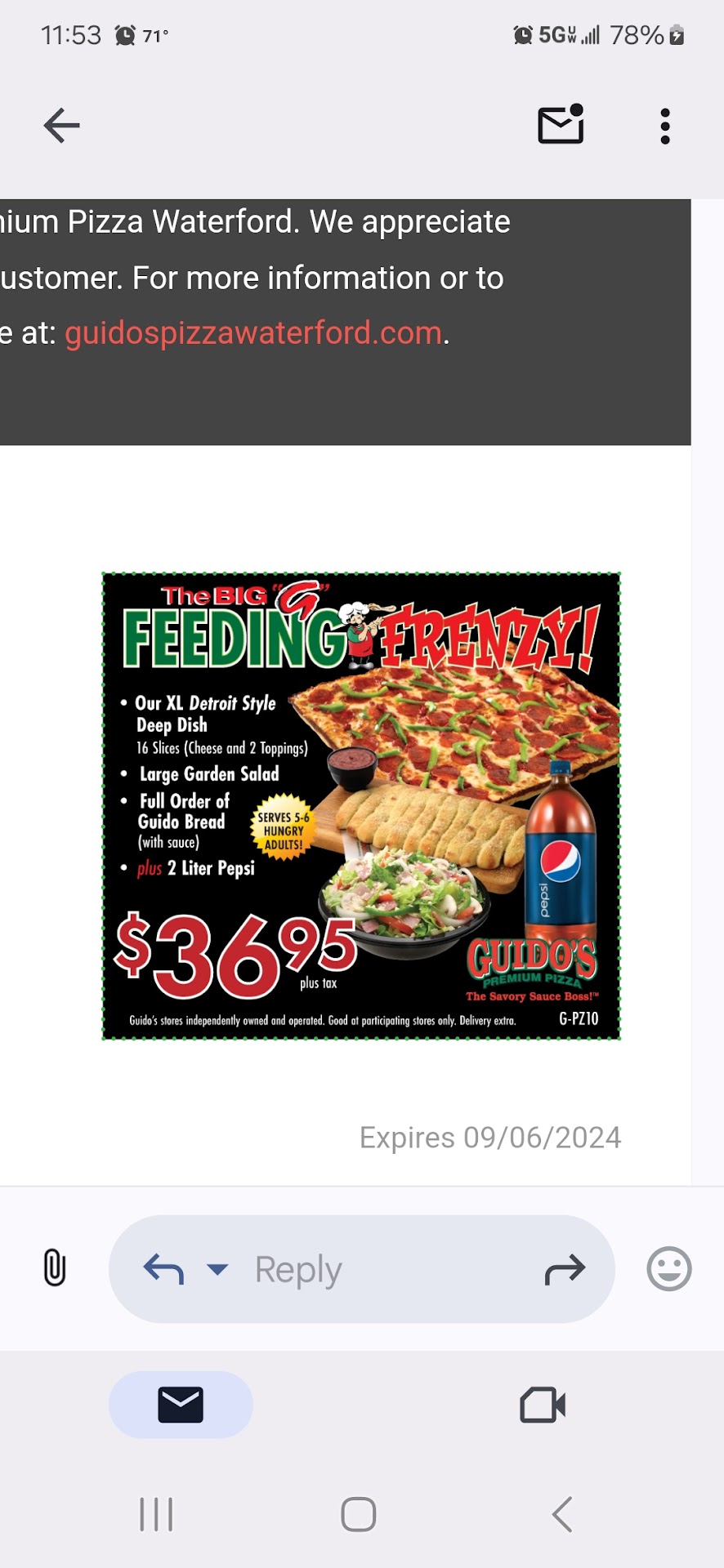 Read moreI keep giving these guys another try, mostly because they're just down the road from me. I got a coupon in my email for the Feeding Frenzy with an offer of the Big G with two items, breadsticks, salad, and a 2L of Pop. I added extra sauce and extra cheese to the pizza. When we got home and opened the box, I noticed it was a regular large round pizza with only extra cheese and my two toppings. Although everything tasted good, I not only did I not get the correct pizza and size, but I didn't get the extra sauce. I will say this though, the staff they had that night was very nice. Since we were headed up north I didn't have time to call them up to try to fix this order.