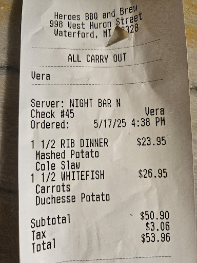 Read moreJust had the worst experience I've ever had in the hospitality industry, and I've worked at an elite country club the last 8 years!! TIM, is the rudest, most arrogant business owner I have ever encountered! We just spent $54.00 on a carry out, we typically order from them at least 1-2 times a month and usually get the whitefish and ribs.This time I got these terrible garlic mashed potatos with my whitefish instead of the Dutchess Potatos that clearly states on the menu it comes with the dinner (which I have always got in the past). I called them to let them know and to my surprise, TIM the owner, rudely told me that's what comes with the carry out orders & its the same potato and that if I didn't like it than DINE IN next time. He than proceeded to tell me he didn't like the way I was talking to him and literally hung up on me, I couldn't believe it!! As evident below, I have attached the receipt that even shows Dutchess Potatos on my order. So all I can say is we will never promote Heros or step foot in this place again. Oh and by the way, both dinners were awful! Please go somewhere else!! There are far too many other resturants where the owners would be more than happy & appreciative to have your business, specially during these difficult times, unlike TIM at Heros!! Shame on him, as he just lost a loyal customer that will continue to steer people away from his resturant. By the way Lions Den is awesome, it not only has great food but excellent...
