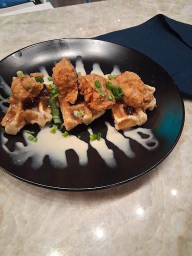 I was in between a few diff items and she showed me a way to combined two items and get to try it all... I got the hosel chips and the chicken and waffle!!! Now the chips were amazing they were potato chip fries essentially with some seasoning on them.. The chicken and waffles was 3 pieces of waffle with chicken bites on top. It also comes w a caramelized Bacon sauce and a sweet sauce. Honestly 10/10.