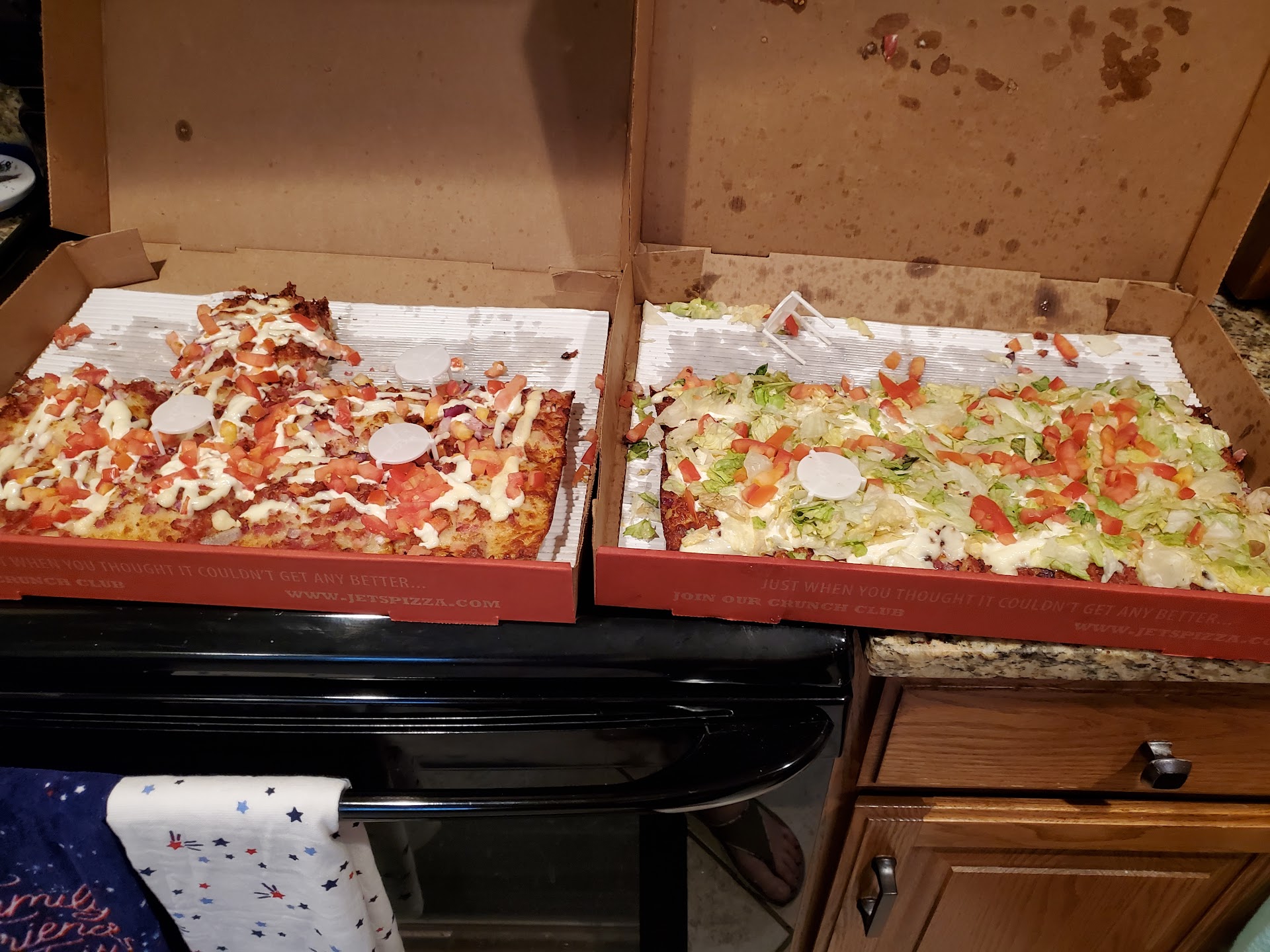 Read moreAll businesses can have an off-day, I understand this. There seem to be a lot of negative reviews for the Jet's in Waterford, though, but the pizza place recommended to us was closed so we took a shot ... we saw a commercial the night before for the Greek pizza which we thought looked delicious, so we ordered a small hand-tossed, as well as a Four-Corners Aloha BBQ Chicken with Cajun crust. Boy are we glad we "chanced it"! Both pizzas showed up before the time promised and were piping hot and absolutely LOADED with toppings. The Greek pizza was a huge hit and the Aloha was the absolute best Detroit-style crust pizza I've ever had! I mean the crust was cheesy-golden brown-crispy-and oh-so-perfectly-chewy that I devoured three of the four corners in record time. On top of all that the delivery driver was very friendly and very nice. She was a real sweetheart. We will definitely try this Jet's again when we're...