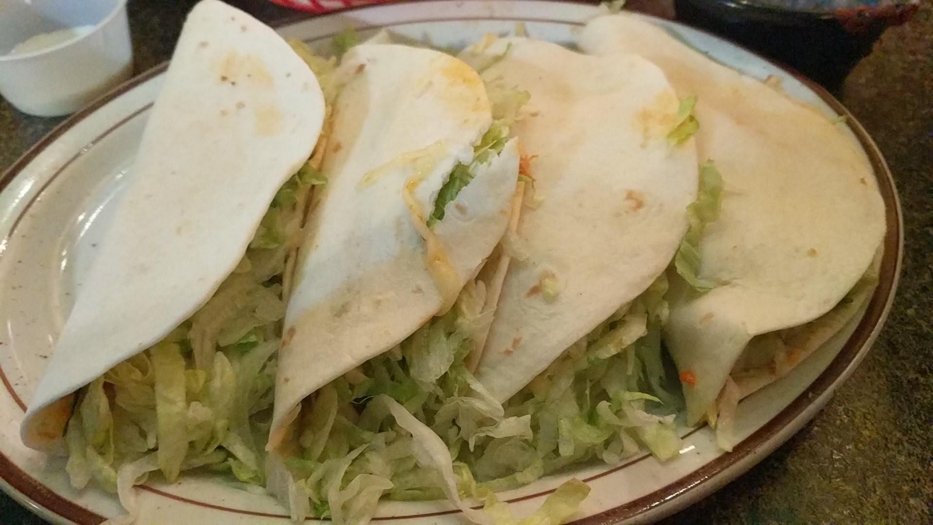 So it took us two years to go back. Happens right ?LOL. The place is looking very run down. It used to be cheery when you walked in. Energetic staff welcoming you. There was one pretty cheery staff member but other staff was sitting at the door. When we left the cheer member was absent and staff was again, just sitting. Our table had that old almost sticky film on top. They were not busy and food was smeared on the floor from previous customers.Our Chips and salsa came out. Initially I thought they gave us two little cups of ketchup. It sure looked that way, a very thick ketchup. And one small cup of which resembled diced stewed tomatoes. Well, the ketchup cups which I think would be regular salsa was plain old tomato paste. There may have been an occasional piece of some kind of spice but … yep plain tomato paste. You could almost stand your knife in it. The “ Hot Salsa” was unimpressive even when we tried to mix the two. My boyfriend who is very familiar with this Establishment was shocked at the change in salsas. His comment” I hope this is not setting the pace for dinner…” was pretty spot on. We ordered the Queso Dip. At my first bite I could not help remarking “ This tastes like soap or some chemical.” At my next two taste tests I could not figure out why. Then it dawned on me, they must put cilantro in their queso dip. UGH “I love me some cilantro” but not heated up in Queso. Queso from other restaurants, in my experience, have not counted on cilantro is their primary flavor. We just could not get past the taste. On to my BF’s chicken enchiladas. Meh, not so great. No flavor. Now onto my combo plate: taco, burrito and my fav pork stew. Yuck, yuck, and yuck. Again a pile of foods with no flavor. The pork was almost tender but lacked any flavor. They use pork that is either slow cooked/braised/boiled, not sure? It becomes the carnitas and they just put some unnamed unflavored gravy over the pork and call it pork stew. I did not eat much as it was just that unappetizing. Oh, I ate the melted cheese I had requested on top. Girls got to eat! The rest I just left. It is sad that I can home and with only salt and pepper ( I would use more than just this when at home;)Just sayin’ here! ) prepare better pork. There appears to be a lack of attention to a plentiful bounty of food. Perhaps there had been a change in owners/management?