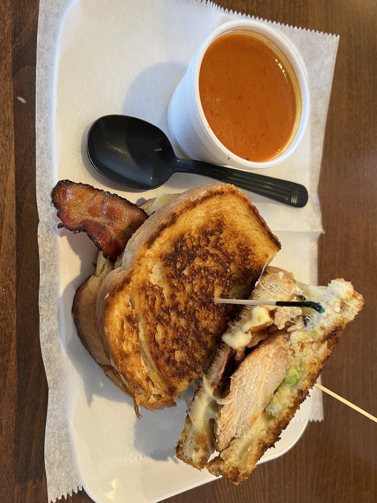 Cute cafĂ© with ample seating in doors and outside on their patio. Lots of items to choose from it was hard to make a decision! From eggs benedict to fancy breakfast sandwiches to elaborate grill cheese sandwiches. I had the Spicy Chicken Grilled Cheese which involved grilled chicken, avocado, bacon, and pepperjack cheese on toasted bread, it was more so a chicken sandwich than a grilled cheese. But it was filling! I saved the other half for left overs. The chicken was cooked perfectly, and the avocado was ripe! My boyfriend got the Shaved Steak Grilled Cheese, which also was more like a steak and cheese sandwich. The onions were cooked well and both dishes came out warm! Each dish also came with a small cup of tomato soup which was warm and tasty. I couldnât pass up a chocolate chunk cookie while I was there, which I took home and warmed up later, a bit too sweet for me, but lots of chocolate chunks in it! It was messy! Iâd like to come back, I have my eye on a few other dishes Iâd...
