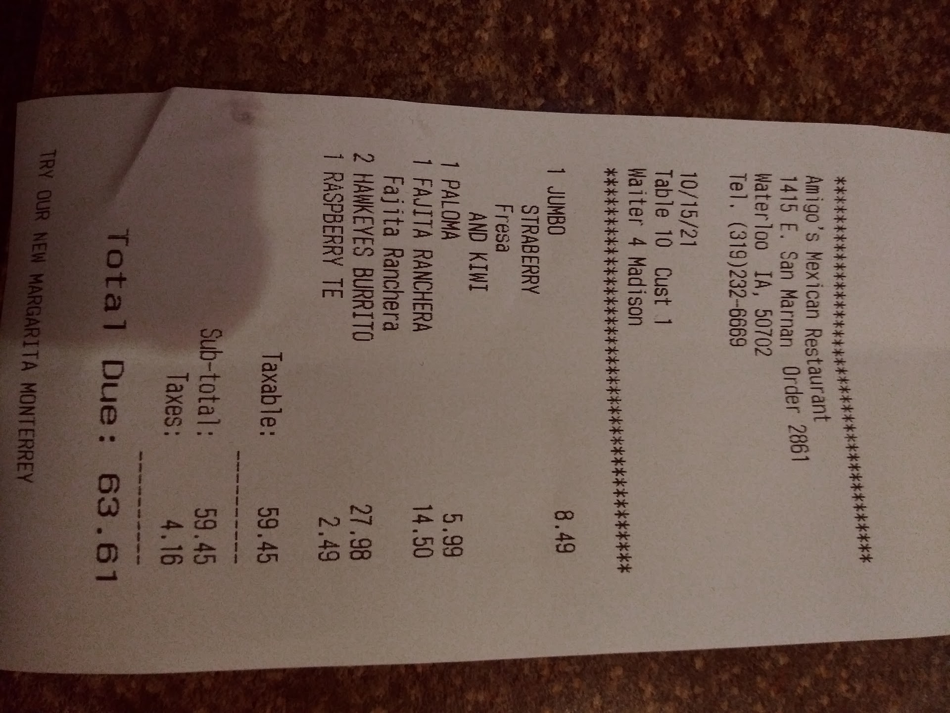 Read moreWell we got seated right away. But then was put in a corner and no one seemed to know who our waitress was going to be. We waited at least 15 mins before someone even came to greet us and ask us what we wanted to drink. We were informed the drink menu was online and that I had to scan a qr code to get it. Ok we order drinks only to find out that my husband's drink a Sangria they were out of. After 15 more minutes if waiting for our drinks. Didn't apologize or ask us if we wanted anything different didn't even offer a drink menu to compensate and help pick a different drink. Nothing. We were waiting and waiting finally it seemed like forever but a nice older lady asked if everything was good and if we needed anything I said yes a drink menu and our waitress. Still didn't see our waitress for another 10 mins. It was the worst service ever. And then when we got our food my husband was brought his fajitas without his tortilla shells the pot holder to his plate was disgusting. Like at least give us a clean pot holder. I am so disappointed in the service we will not be going back. What a mess we were at the resturants for almost 2 HOURS during peak dinner time you would think they would want to get us in and out. Nope...
