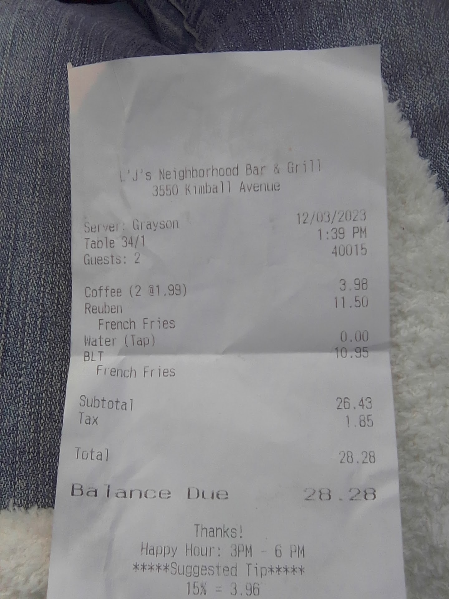 Today after church went to LJs neighborhood bar and grill. First of all, the waitress heard nothing about the order that was said. Like no fries brought anyway then charged us for the hem stating that it would be the same no matter fries or not. Hello, not the point. The point being I did not want them. I ordered BLT with cheese and no cheese . There was no tomato. They had no cream for coffee and coffee came not hot. When asked a few times finally got spoon to stir coffee. Was charged for things I did not want my sandwich was very bad. I don't know what kind of man is they use they need to get a different kind it is very nasty. I I would suggest if you go there to please try the mayonnaise first before you put it is very bad. Here is the receipt, The waitress then proceeded to meet a colleague which I believe was maybe the floor manager up by where that food comes up and proceeded to talk about me because I did not like her putting the fries on there. The coffee cold. I chalk this experience that we had on the waitress, I have never had a worse waitress. Very unattached to her Job at hand and only willing to do nothing or go extra step that meal was satisfying. Although the gentleman I was with had a Ruben sandwich and fries that was very good he said. But again the staff was not. Very bad...