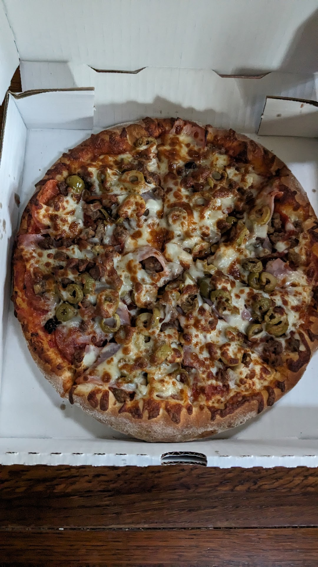 I recently savored the Tasty Supreme pizza from Tasty Pizza in Waterloo, Indiana, customizing it without green peppers for my first trial. The experience was nothing short of delightful. Right from the first bite, the crust impressed me with its perfect bake and texture. The toppings were cooked to perfection, each ingredient melding harmoniously while retaining its distinct taste.