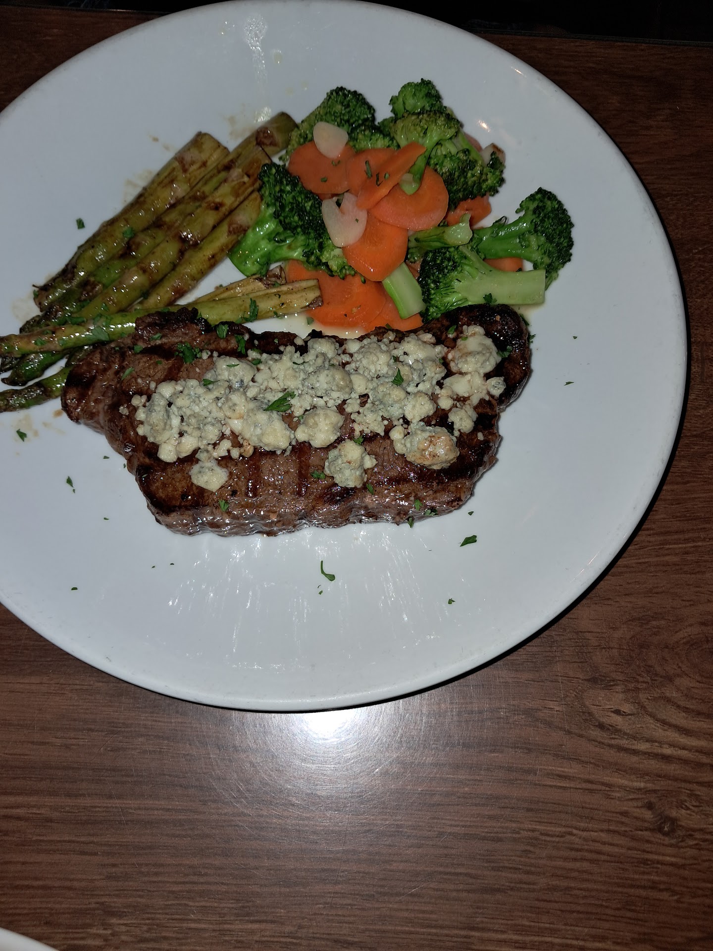 Photos above show that shrimp scampi dish and the Ny strip dish. Both, pleasant to the eye, but overwhelmed with too much garlic. THE DETAILS::