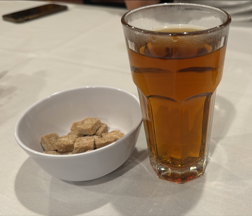 We got the bill without asking - service included! (without asking!), not sure why but we still chose to order tea and some pastry for desert. The tea came in paper cups, the pastry was heated in the microwave and again brought on a paper plate. :-(