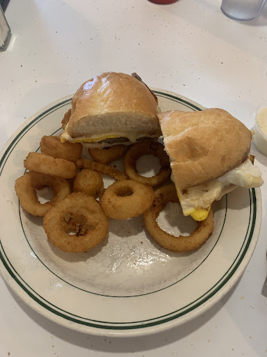 The space is small, but we ate at around 10 on a Saturday and it wasn’t super busy. Our waitress was kind and quick at taking our order. The food arrived just as quickly. I had a breakfast sandwich with sausage, egg, and cheese. I wasn’t a fan of the sausage, so I think next time I would opt for ham. The onion rings were excellent. My partner had a double hamburger and fries, which he enjoyed.