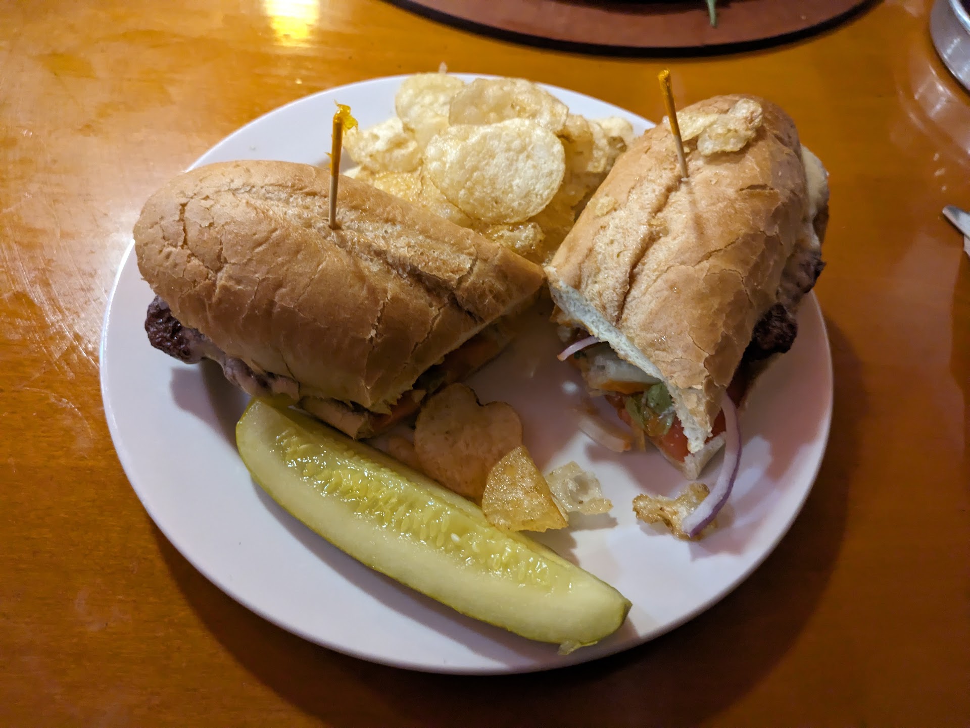 I ordered a burger. I didn't realize there were bread options, wasn't asked by the server, so she just put me in for an Italian roll. Gotta say, not my first choice, and it ended up being some sad little Italian sub roll burger affair. You are stuck with chips. They won't sub fries. I think they don't want to sell fries.