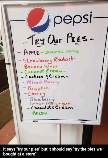 Read moreI live in South Florida but work oil field in North Dakota. guys I work with wanted to have the Sunday Breakfast Buffet after our night shift on Easter. walking in... the place is very clean and the staff is nice. it looks like a place you would see on Diners, Drive Ins and Dives... in appearance ONLY. There is a very prominent sign stating "Try our Pies".... and lists 13 different pies! I'm excited! Then I asked if they had grits and was told "you wouldn't want them if we had them". I'm not so excited now. 2 guys order the buffet, I order 1 egg over medium and small biscuits and gravy (saving room for pie) 2 guys come back with pre made waffles and powdered eggs. POWDERED EGGS?!? my meal arrives shortly with an overcooked egg, store bought biscuit and canned gravy. really? they don't make anything... but I'm still holding out for pie. I ask our nice waitress "do you make the pies here? ". she replies "we just bake them". the sign should say "try the pies we bought at Cashwise" the only thing they made was my chocolate milk. we were very disappointed. I don't understand how a restaurant can serve pre made...