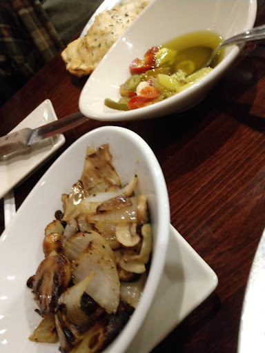 Food was ok. We ordered an appetizer of peppers in oil and warm bread. Outstanding! My main course was the broiled seafood platter. It came with two side choices. The platter was what was expected: two scallops and shrimp (all cooked to perfection), a large piece of white fish (just a bit dry), and a crabcake. All swimming in a large amount of butter (I like butter but it was a bit too much for me). My sides were a baked potato and a bowl of sauteed mushrooms and onions. The ratio of mushroom to onion was extremely thin.