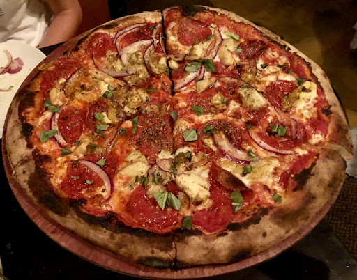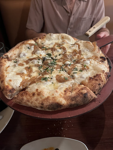 Quite a unique experience! Not your regular accustomed pizza menu. Far from it. The selections are incredibly artistic, culinary wise, and they work wonderfully! Had a party of 9 for sister in laws' birthday. It took some time for the elders in our group to adapt to/choose their likes and wants off the menu. But that seemed part of the experience. Pricey we thought at first but were pleasantly surprised at the doable bill! Only have 12" pizzas. We ordered 5. Brick oven, fast cooked. Puffy and partially charred outside edge crust which most of us left on our plates. This, from those who would normally "eat the bones." Extraordinarily thin and not crispy under crust. Each pizza was amazingly, uniquely bursting with perfectly matched flavored which danced on our tongues! Appetizers of artichoke dip and an onion dip with artisan bread & lemon basil wings were all wonderful, as well. Only reason for not giving 5 stars was their insistence on not seating us until all parties were there. We had 4 elderly who would have welcomed a regular height seat rather than the too high bar height chairs. We were the first customers at their 4pm opening time. Made to hang out (kept our coats on due to draft from brisk single digits temps outside) as customers started arriving) by the front door where there was a professionally groomed bar and tenders were. Could have been seated comfortably and ordered a few rounds of drinks had they seated us. Servers are mature women who do a fine job. By the time we left, the place was packed with many waiting for a table! Great atmosphere. And, oh! The family style salad and the birthday teramasu were...