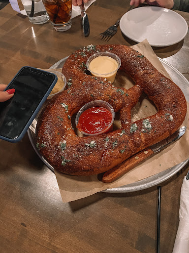 We sat at a high table in the bar area and were comfortable. We ordered the Parmesan Pretzel. When I asked the waitress if it would feed four, she laughed at me....and rightfully so. The pretzel arrived and it could have fed a family of 8 easily! It was so tasty. I really like the Honey Mustard, but the Marinara and Gouda were also good for dipping. We had 4 people nibbling at the pretzel, and we weren't able to finish it - but we did certainly try. The other appetizers on the menu resemble typical bar food with an elevated flavor like the pretzel I imagine. I hope to return to try the Spinach and Artichoke Dip.