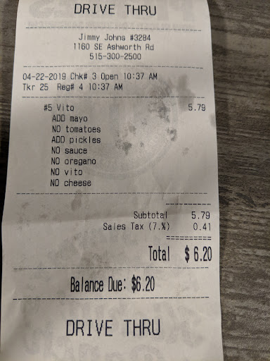 Read more2:30 Saturday afternoon drivethru, no other customer vehicles. Ordered 2 Jimmy Junior turkey sandwiches with Cheese @ $3.99 each. Two lemonades. The employee said the total was $22+. We said no way. Drove on to the window. Price corrected. Employee now tells us they only have enough turkey for one sandwich and they were out of the bread it usually came on. We cancelled one sandwich. Refund. Sandwich delivered thru the window after an extended time. Lemonade? She still had to pour the lemonade. SMH. Get the sandwich home and unwrapped. On whole grain bread. Kids won't eat that kind of bread. Ridiculous service. Grand daughter called it...
