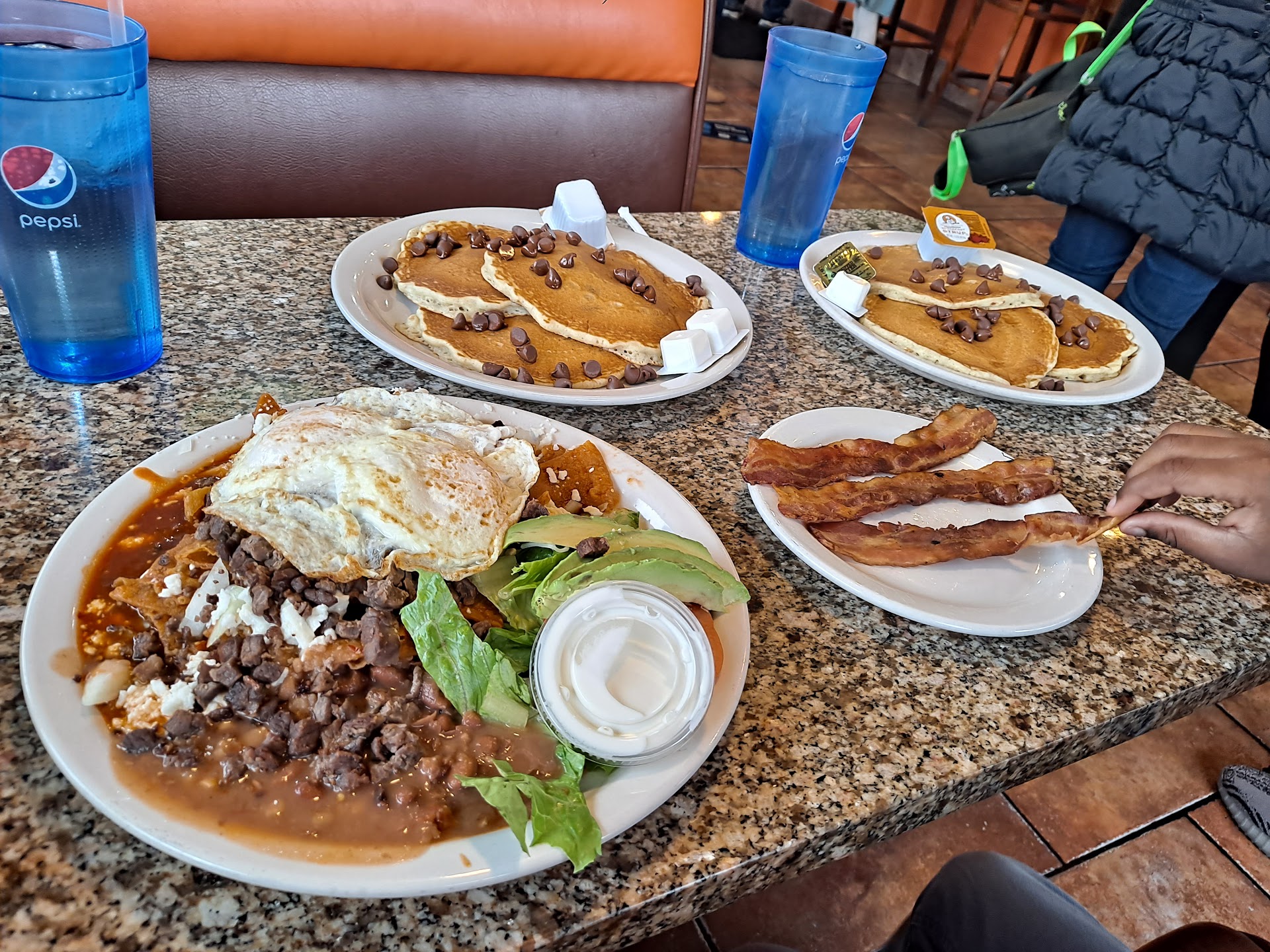 Again, Oh Man! So yesterday I went here for the pannini I like, but actually ordered the wrong sandwich, it was still good. I finally tried the crepes, and I'll have to say I personally don't like crepes like I thought I would. Still good again, chocolate chip probably been better. But man oh man, I ordered my baby the chocolate chip pancakes 😭 and he tore them thangs up. I had just a bite and was like damn we gotta go back for more. Definitely giving my favorite breakfast spot out here a run for they money. And that's what we did today. I checked out the menu to see what this lady was eating yesterday, it was there popular chilaquiles. I added onions, avocado and asada. Had it with the red sauce and I was thoroughly impressed! 👌 👏 We'll probably be back next week. 😅 Well worth every dime. Oh, one more thing, they are so freaking fast with your order. At minimum 10-15 minutes depending on how much you're ordering.