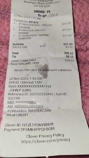 Read moreMy boyfriend and I Ordered online for pick up. Ordered 4 rolls and seaweed salad, our total with a 15% tip came to $72 and it said it would be 20 minutes. My boyfriend went inside and arrived at the given pickup time and they said it would be 5 more minutes. No problem, he waited and they gave him our order. He came back out to the car and checked the bag which only had 2 rolls in it. Our correct receipt was attached to the bag so we figured there was a mix up. He went back in and apparently our order was given to someone in the drive thru. I was a little disappointed because we had to wait again for our entire order to be remade. They made it fairly quickly and we got home and realized no chopsticks or soy sauce was given to us. Im sad we tipped beforehand as it was definitely a bad first experience here. We were so looking forward to this place for a while now and after waiting for our food for so long we weren’t even supplied with utensils or condiments. The sushi was good but not good enough for the...