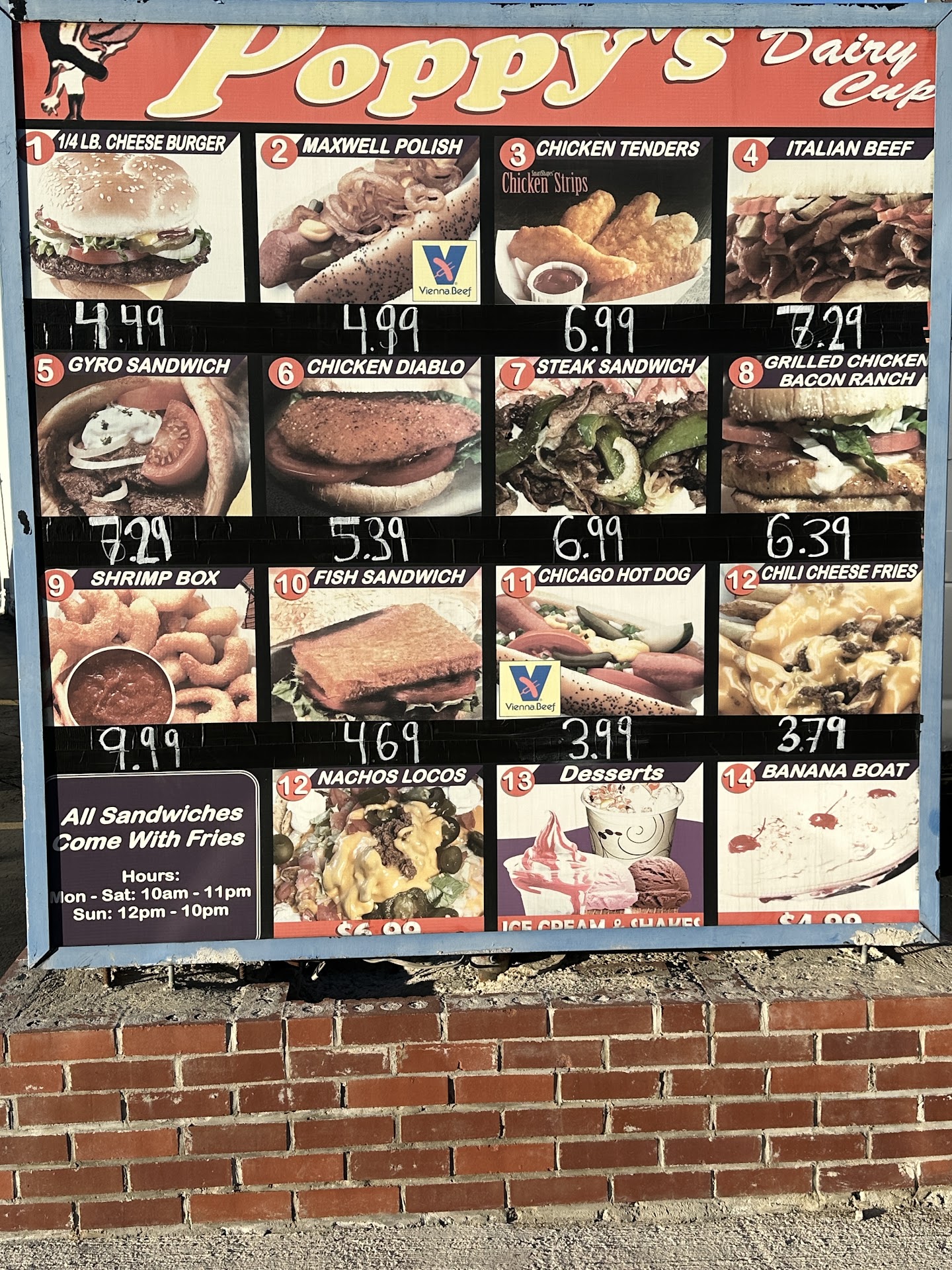 Very inexpensive stand, the food is decent, the price is excellent. No frills, but when you're hungry, you can do without the frills. Pick up and go, or eat outside on their umbrella covered benches. Their half pound burger is really quite tasty, thin and crispy fries, yum, ccompared to the cost of other Burger providers, this is a big winner. Their Chicago dogs are also very good. Years ago, this used to be a shirls But the prices are much less than Shirls. If you only have a few bucks, this is the place to go. And, you can see the kitchen from the front counter, very organized...