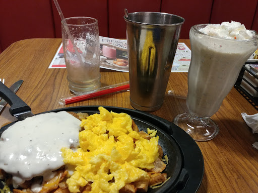Country Friend Steak and eggs skillet, cake batter milkshake, and an orange juice. It took another 15 minutes for the food to come out, but in the meantime I was entertained by the local drunken low-class people you see in every "Denny's Brawl" video. They were loud, fighting over nachos, heavily slurring words, etc. Once I heard them get quiet I turned around and they were just blankly staring at me. Later on some more rowdy customers came in and argued with the waitress over the survey on the back of the receipt...and another guy yelling about water and hot cocoa...